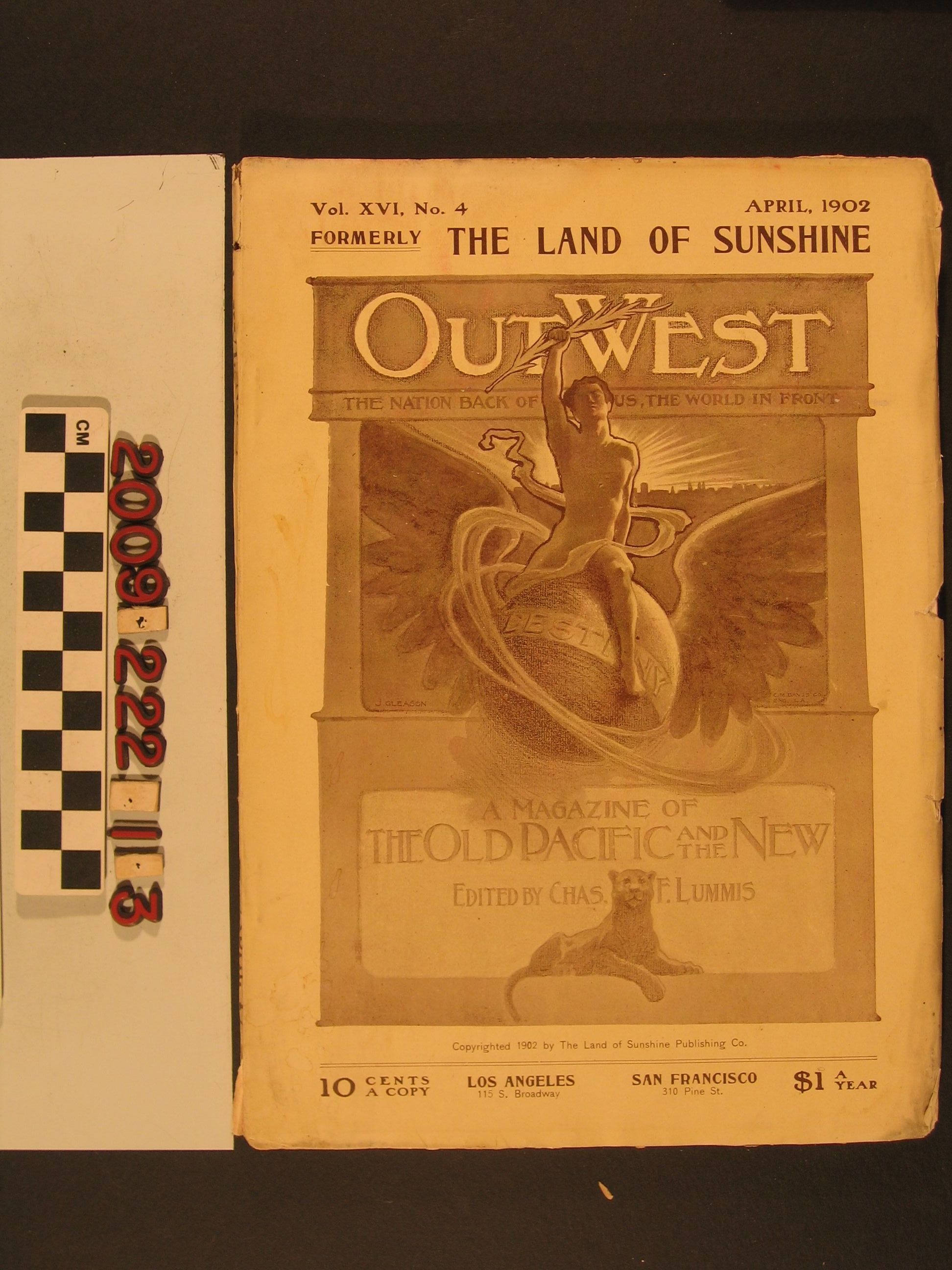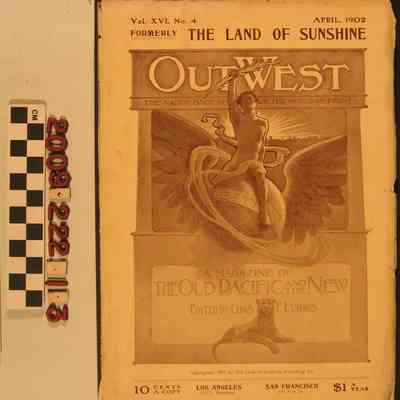 "Out West," April 1902 (Vol. XVI, No. 4), published by Land of Sunshine Publishing Company, Los Angeles. The journal includes short stories, poetry and features on citrus, the exploration of the Pacific Coast and the journal of Junipero Serra in Baja California and others. The item is well-illustrated and features many advertisements for local businesses. With edge tears and soiling on wrappers and generally clean pages, the condition is overall fair.Lexicon