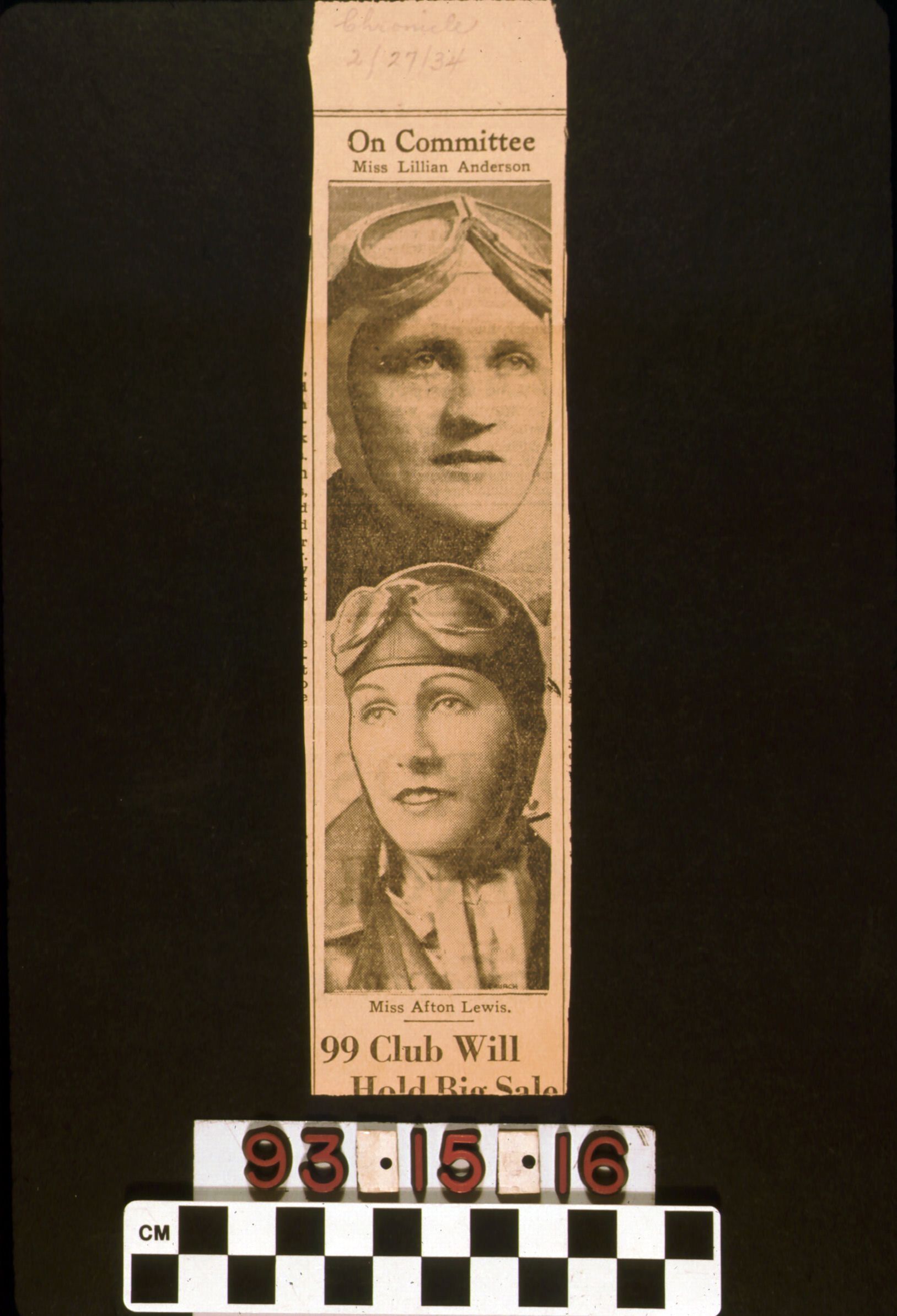 A newspaper clipping from the 27 February 1934 issue of the San Francisco Chronicle regarding a rummage sale of the 99 Club of women aviators, including Marian Trace, from whose collection this clipping is from. Is accompanied by a photo of two of the club members. Condition good, the lower part of the article folded over. Written in pencil at the top, "Chronicle/2/27/34".