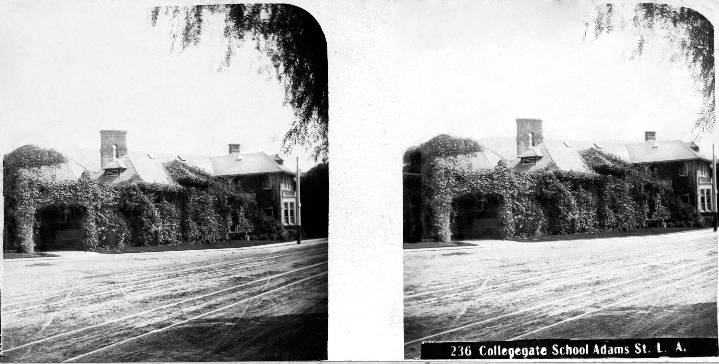A stereoscopic photograph, "Collegiate School, Adams Street, Los Angeles," by Garden City Foto Company, ca. 1898. The overall condition is good.Lexicon