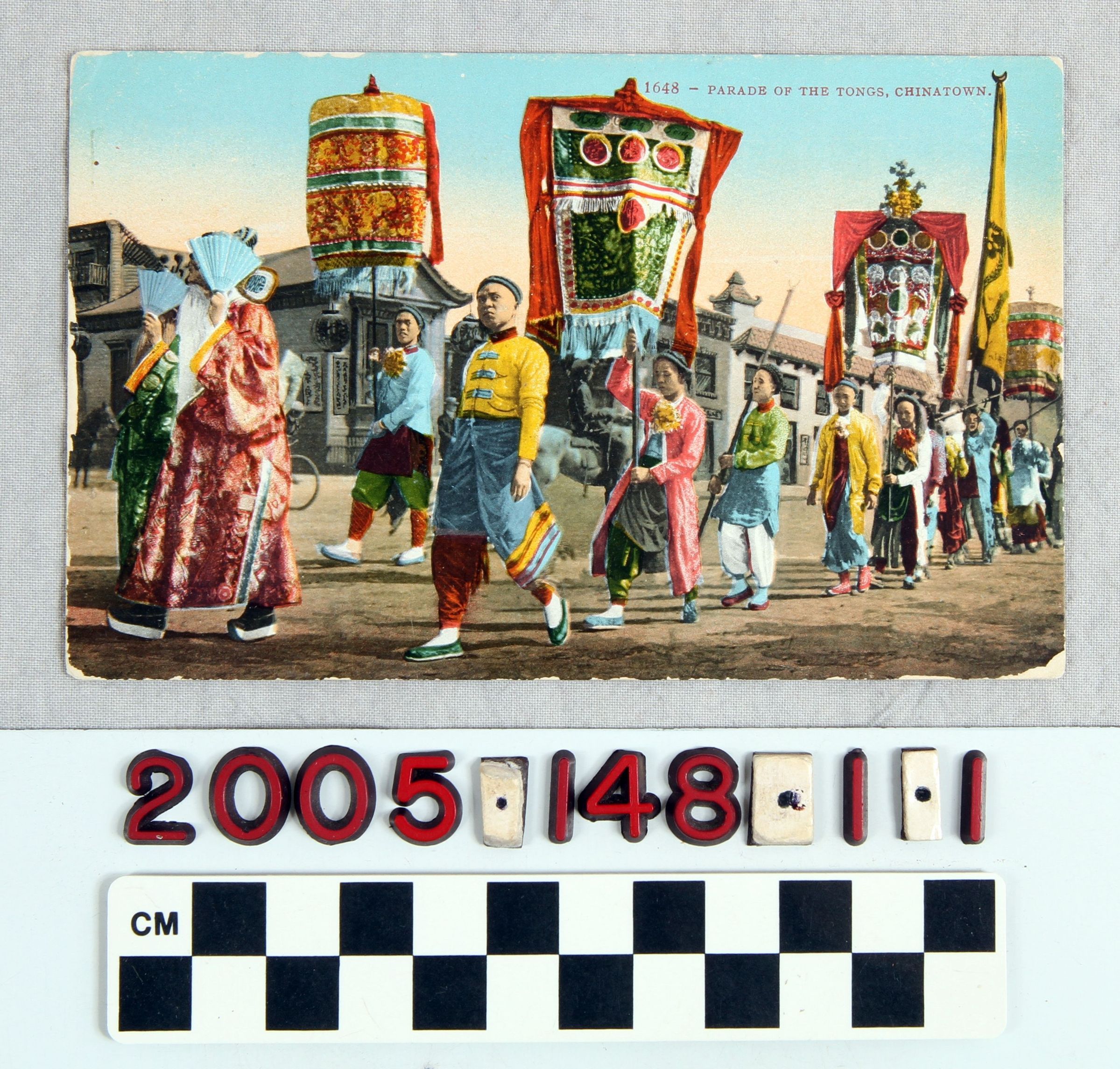 POSTCARD, "1648 - PARADE OF THE TONGS, CHINATOWN," Los Angeles, dated September 3, 1910. Color postcard depicting a parade in the Los Angeles Chinatown. Postcard has been written on but not sent. In good overall condition, edges are abraded.Lexicon