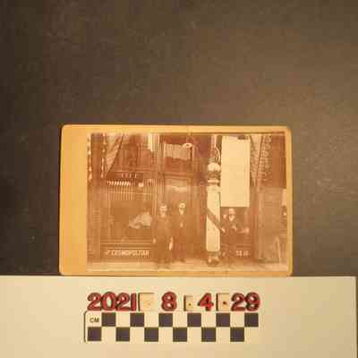 A photograph of three men posed in front of the Cosmopolitan Baths barbershop, ca. 1880s-1890s. The three unidentified men stand near the entrance of the barbershop dressed in suits. With minor soiling, minor edge wear, minor discoloration, and minor abrasions, the object is in fair condition overall.