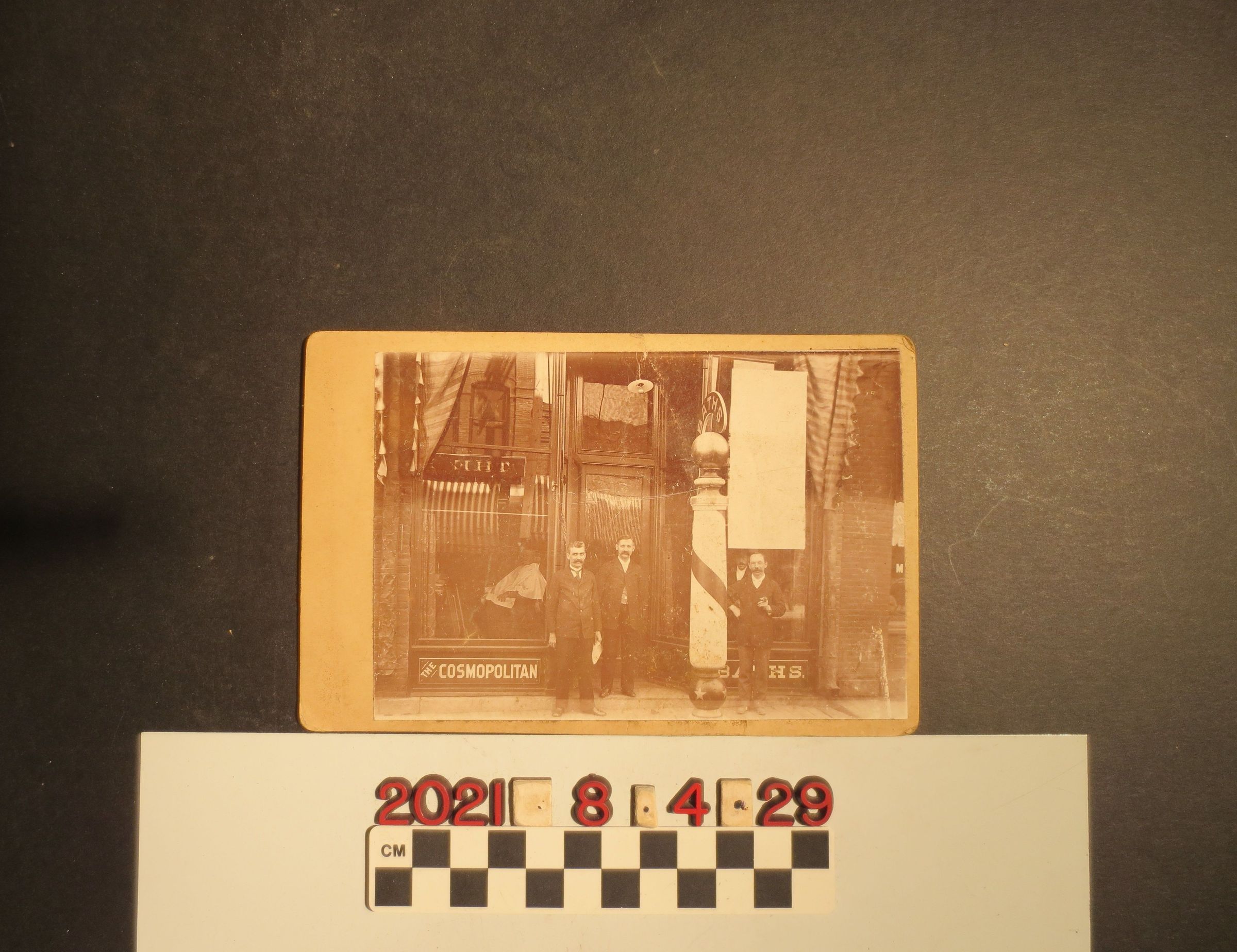 A photograph of three men posed in front of the Cosmopolitan Baths barbershop, ca. 1880s-1890sEntry/Object ID