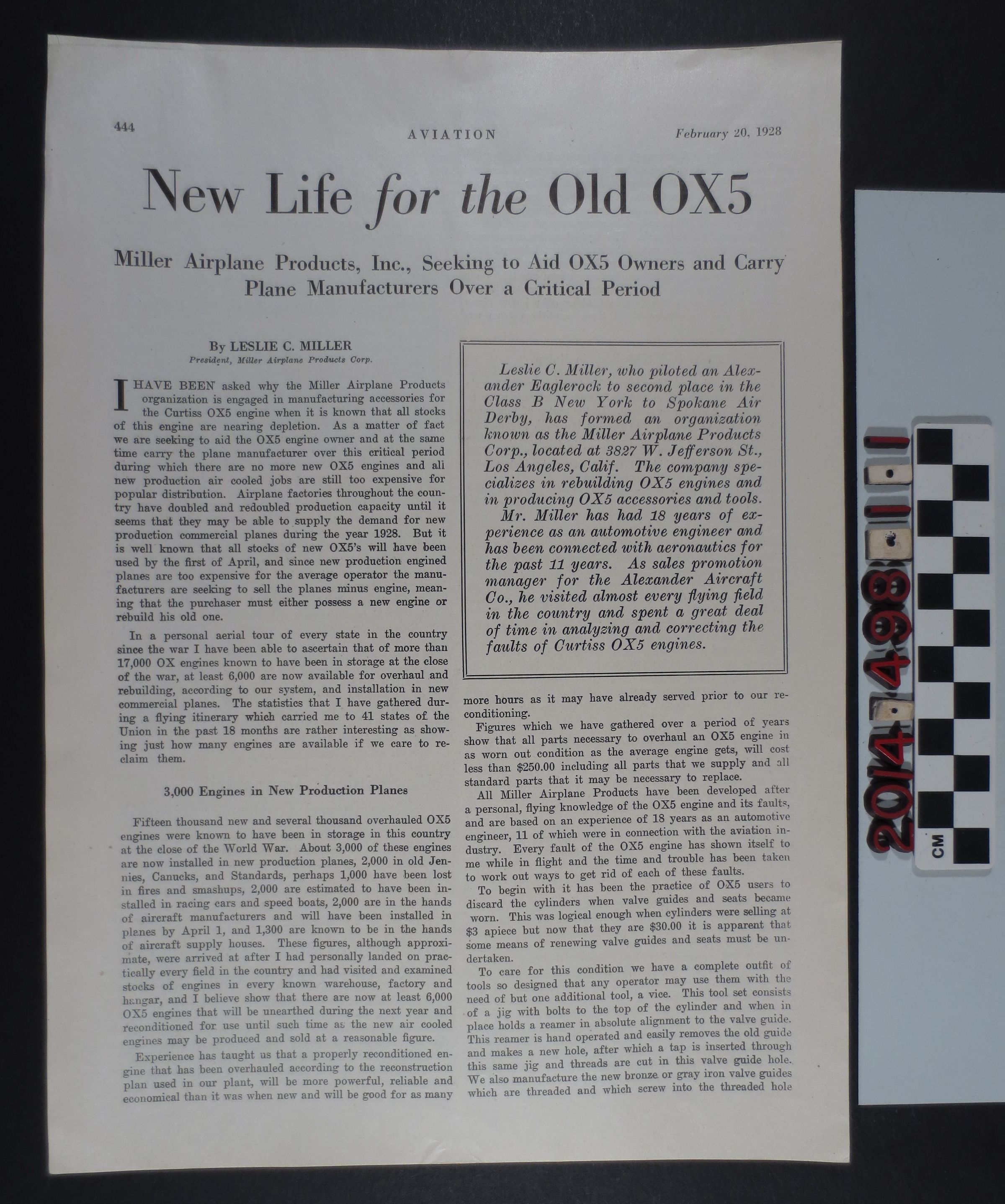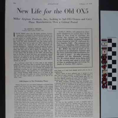 "New Life for the Old OX5," by Leslie C. Miller, an article removed from "Aviation," 20 February 1928, pages 444-445. Miller, the President of Miller Airplane Products Corp., discusses the eventual end of producing the Curtiss OX5 engine in airplanes and what the company is prepared to offer these engine owners. The article is illustrated with a photograph of Miller next to an Eaglerock plane. The loose article is in good condition.
