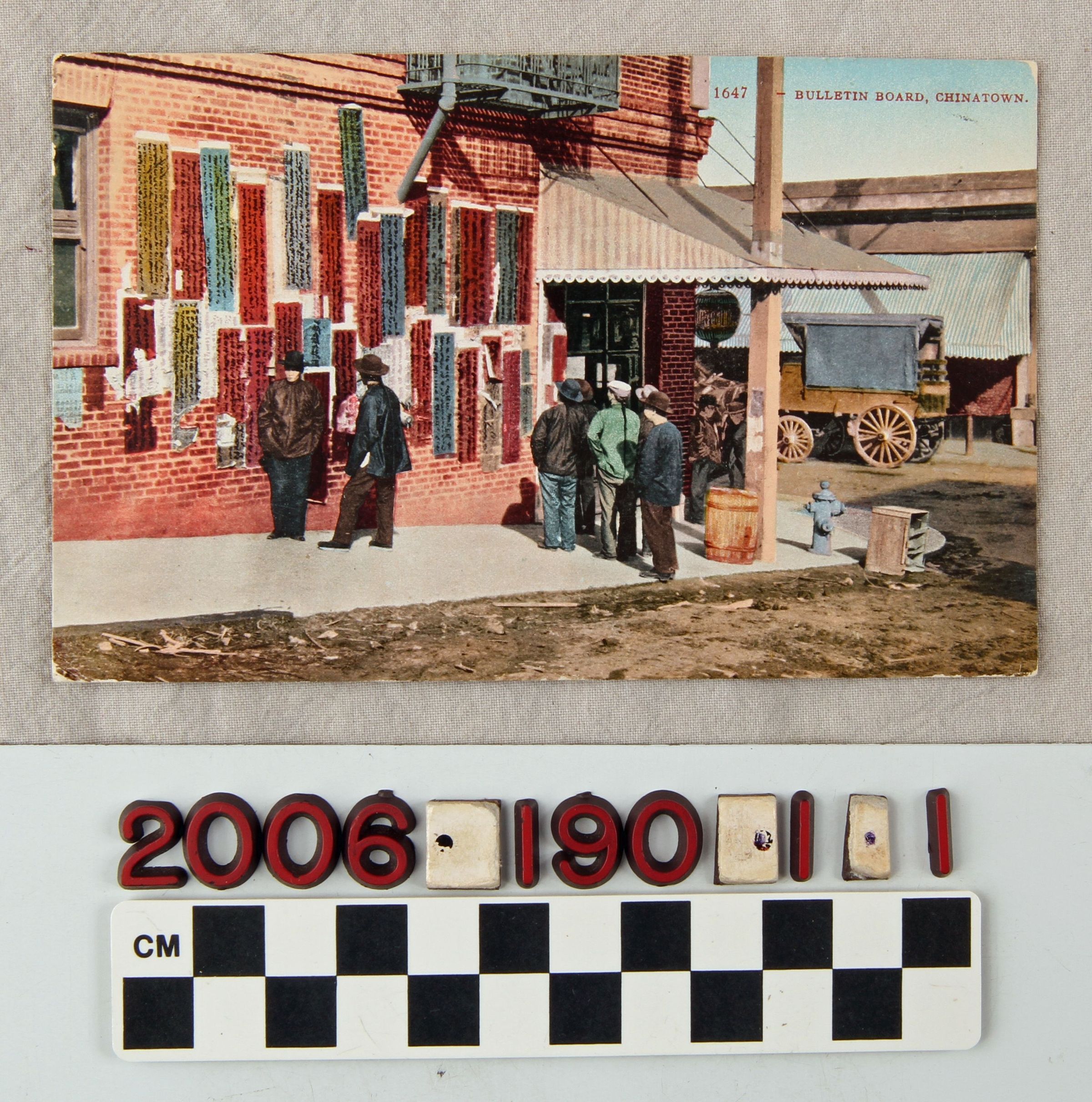 A colored photographic postcard, "1647 - BULLETIN BOARD, CHINATOWN," Los Angeles, by Edward H. Mitchell, Publisher, San Francisco, postmarked 11 December 1909. The image is of a gathering of Chinese men near notices posted on the wall of a brick building in the Chinatown district of the city, now the site of Union Station. The message on the reverse asks "Do you think you could read those signs?" The reverse has the message, an address, the one-cent stamp, the postmark, and the cancellation stamp. The condition is good.Lexicon