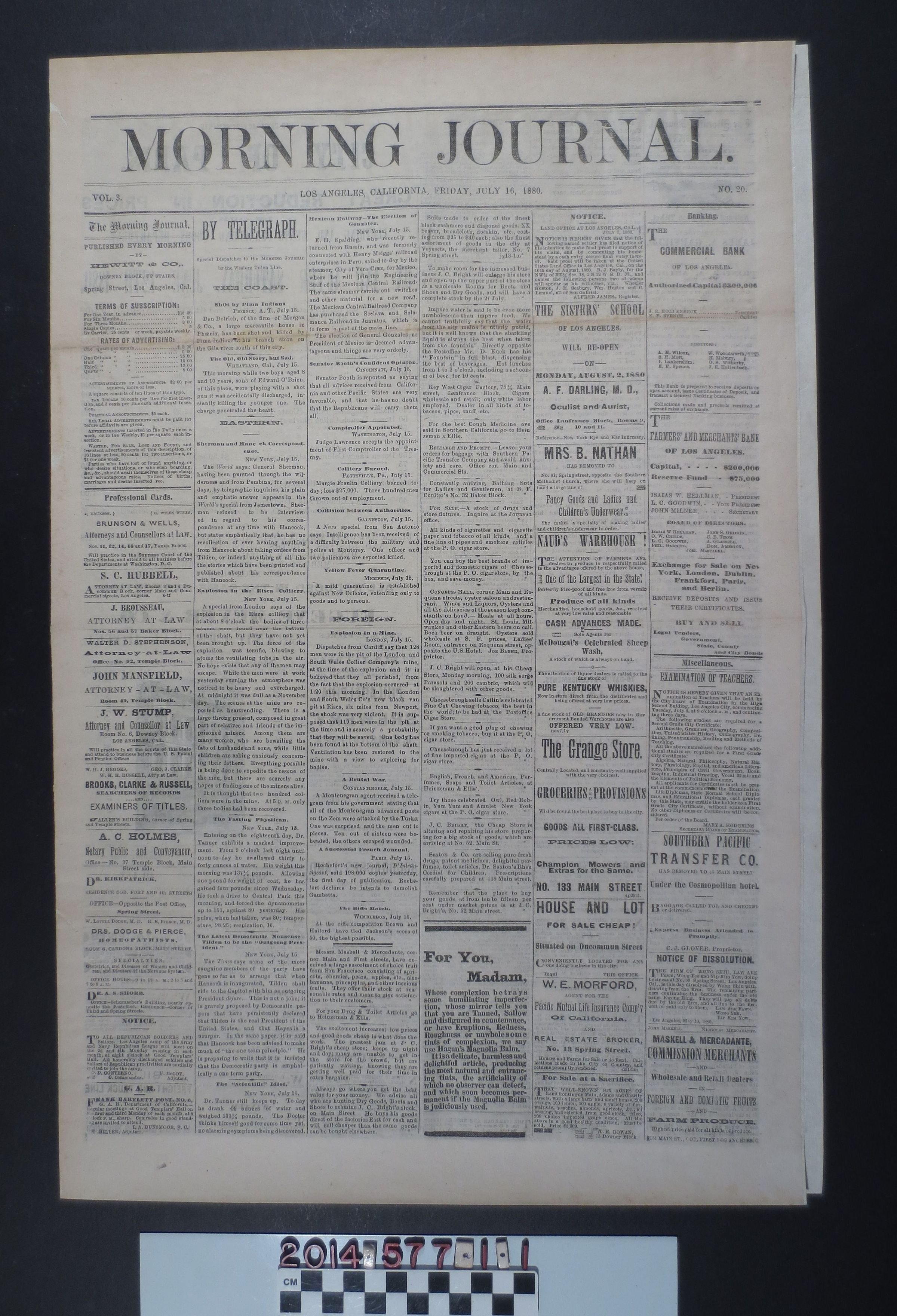 "Morning Journal," 16 July 1880. A daily publication from Los Angeles featuring mostly advertisements, notices and announcements. A few short articles with eastern state and international news. The newspaper is in good condition.