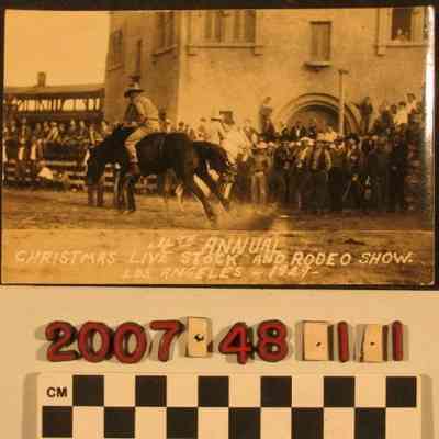 A real photo postcard, "4th Annual Christmas Live Stock and Rodeo Show, Los Angeles - 1929-." The image shows a rider on a bucking bronco, a man on a horse behind, and spectators gathered nearby watching the proceedings. In the background is a building and what may be a grandstand. The caption is at the bottom. On the back is printed material for the card, which is postally unused. With some curving of the paper and light soiling and discoloration, the overall condition is fair.Lexicon