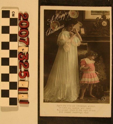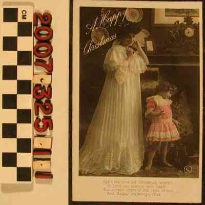 A colored real photo postcard, "A Happy Christmas," E. Alexander Ltd., London, postmarked 24 December 1909. The image is of a mother and daughter posed in a parlor with the title at the upper left and a four-line poem at the bottom. The reverse has publishing information, space for the message and address, a stamp and postmark, and a very brief message. With soiling and edge wear, the overall condition is good overall.Lexicon