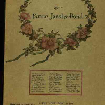 Songbook- "Songs Everybody Sings" by Carrie Jacobs-Bond (Boston: Carrie Jacobs-Bond & Son), 96 pp. A collection of 30 popular songs with an introduction by the editor, accompanied by five photos. The front cover shows a wreath of flowers with the author's name in the center; the title appears just above this wreath. Below in a red frame are the song titles. On the back cover is a similar wreath with "Bond songs are the key to every heart." in the center. The condition is good with some discoloration, edge wear, and creases. "Ruth Rehm" is handwritten at the top left of the front cover; "Booth Music Co., Lamar, Co." is stamped at the bottom left of the front cover in black ink; "117 West Myrtle, Fort Collins, Co." is hand written at the top left of the back cover.Lexicon
