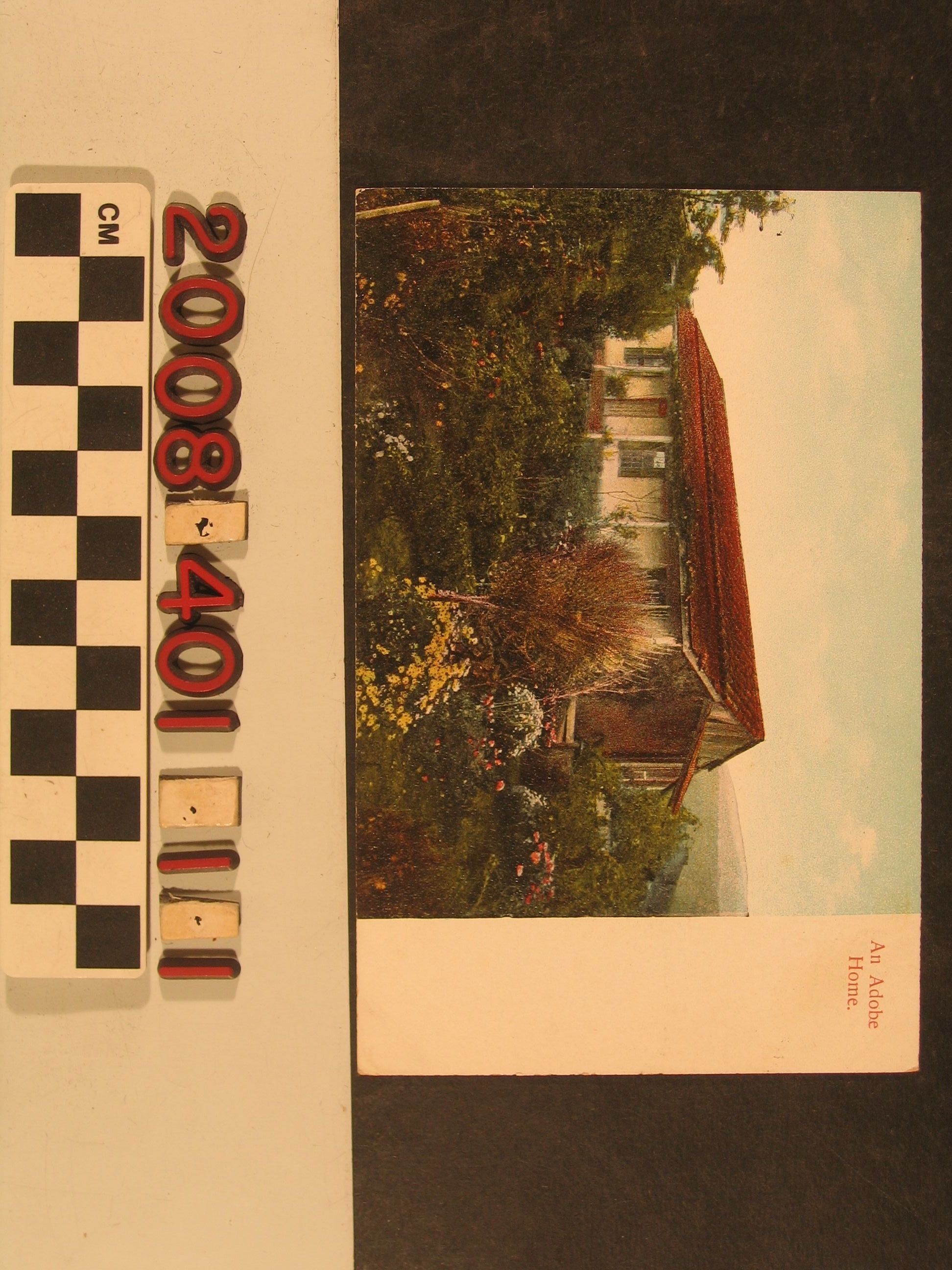 "An Adobe Home," published by M. Rieder, Los Angeles, ca. 1910. The view is a colored photograph of a one-story structure with a porch, a tiled gabled roof on a wood attic and what appears to be a wood addition behind the building. In the foreground is a lush garden with flowers, shrubs, and small trees. In the distance are some hills or mountains, but there is no description as to location. The unused card has space for a message and address, as well as stamp box. With some edge rubbing and light soiling, the condition is good.Lexicon