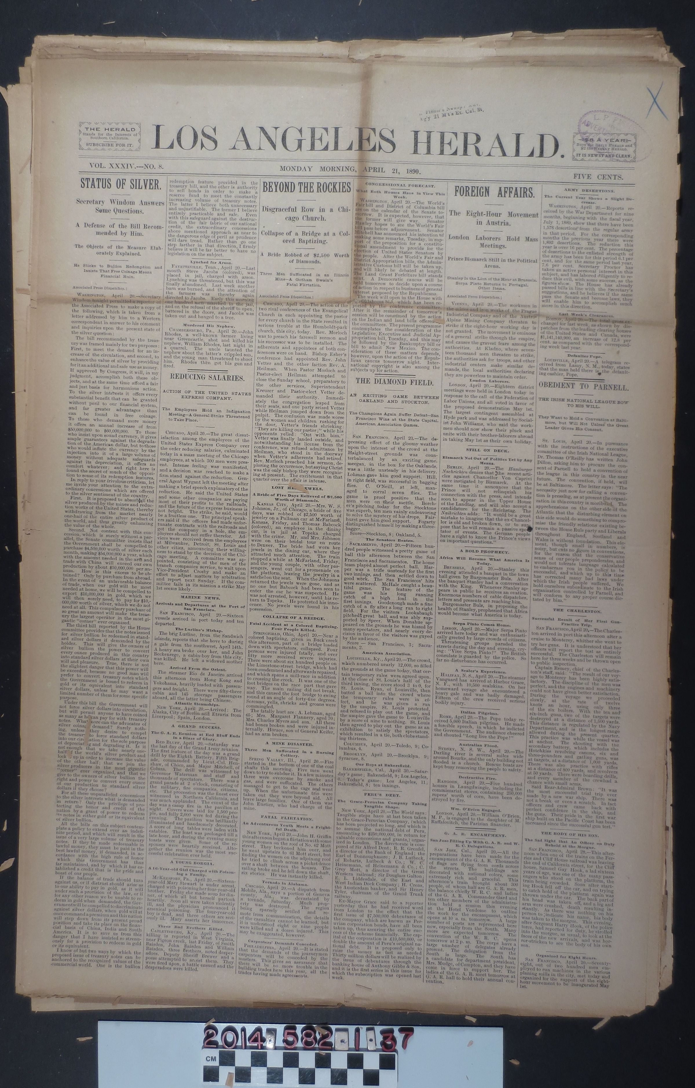 "Los Angeles Herald," 21 April 1890. Includes articles, notices, announcements and advertisements. The newspaper is in poor condition, brittle throughout with some moderate staining.