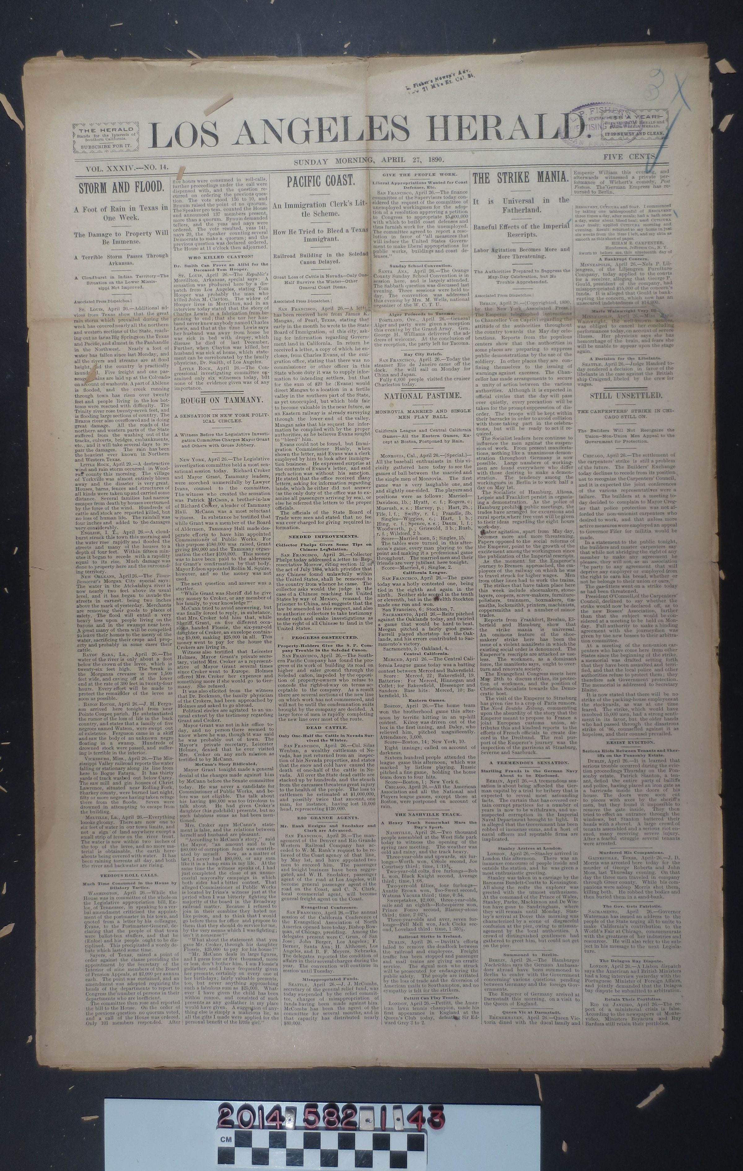 "Los Angeles Herald," 27 April 1890. Includes articles, notices, announcements and advertisements. The newspaper is in poor condition, brittle throughout with some moderate staining.