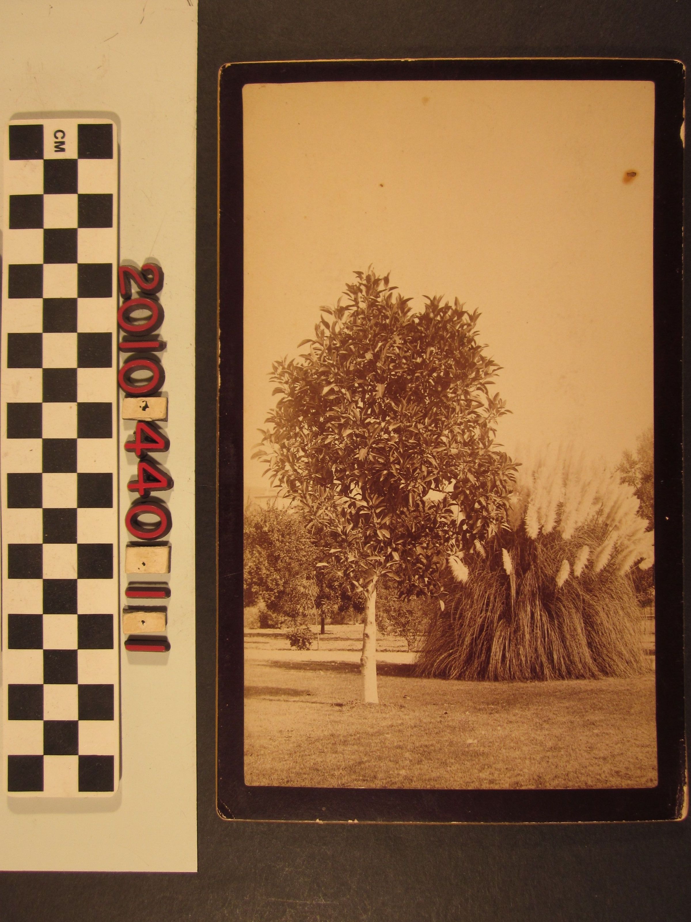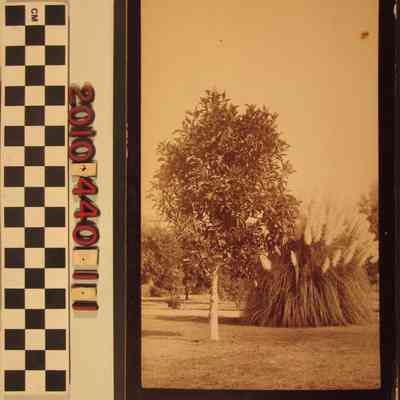 "Pampas Grass & Rubber Tree," Ellis and Son, Los Angeles,1880s. The image shows an expansive lawn with the roughly ten-foot high tree and wide, spreading grass in view. In the background are a walk and portions of other landscape as well as a small section of a building, though the location is not specified. The title is written on ink on the reverse, which also has the photographer's stamp. With small stains not materially affecting the image, slight mount curvature and edge rubbing, the overall condition is good.