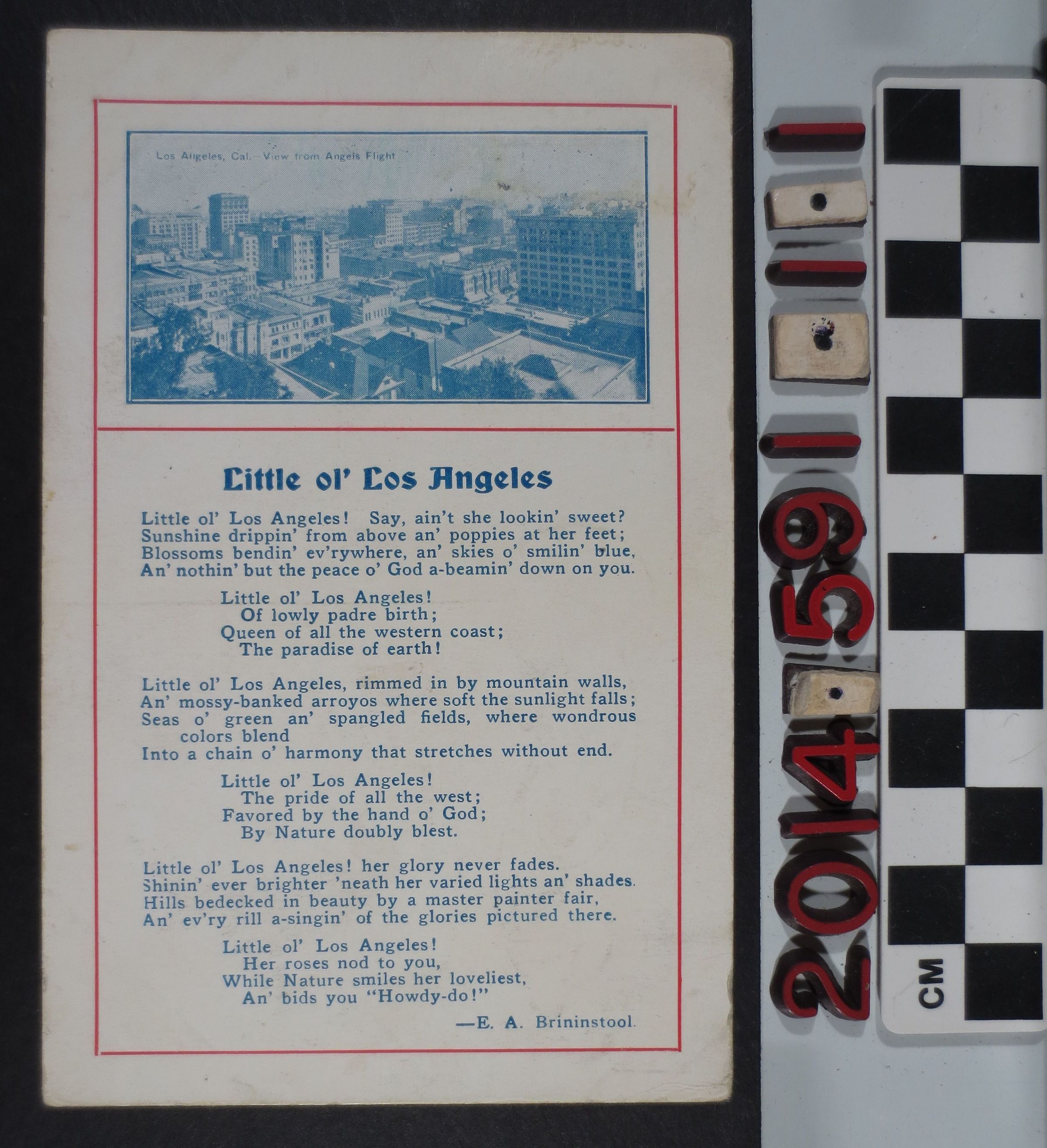 "Little ol' Los Angeles," postcard with printed poem by E. A. Brininstool, 3 June 1917. The postcard features a blue tinted photograph of Los Angeles, the view from the top of Angel's Flight, along with a poem about Los Angeles personified as a woman. The card was sent to Michigan and includes a postage stamp. The item is in good condition with minor surface soiling.