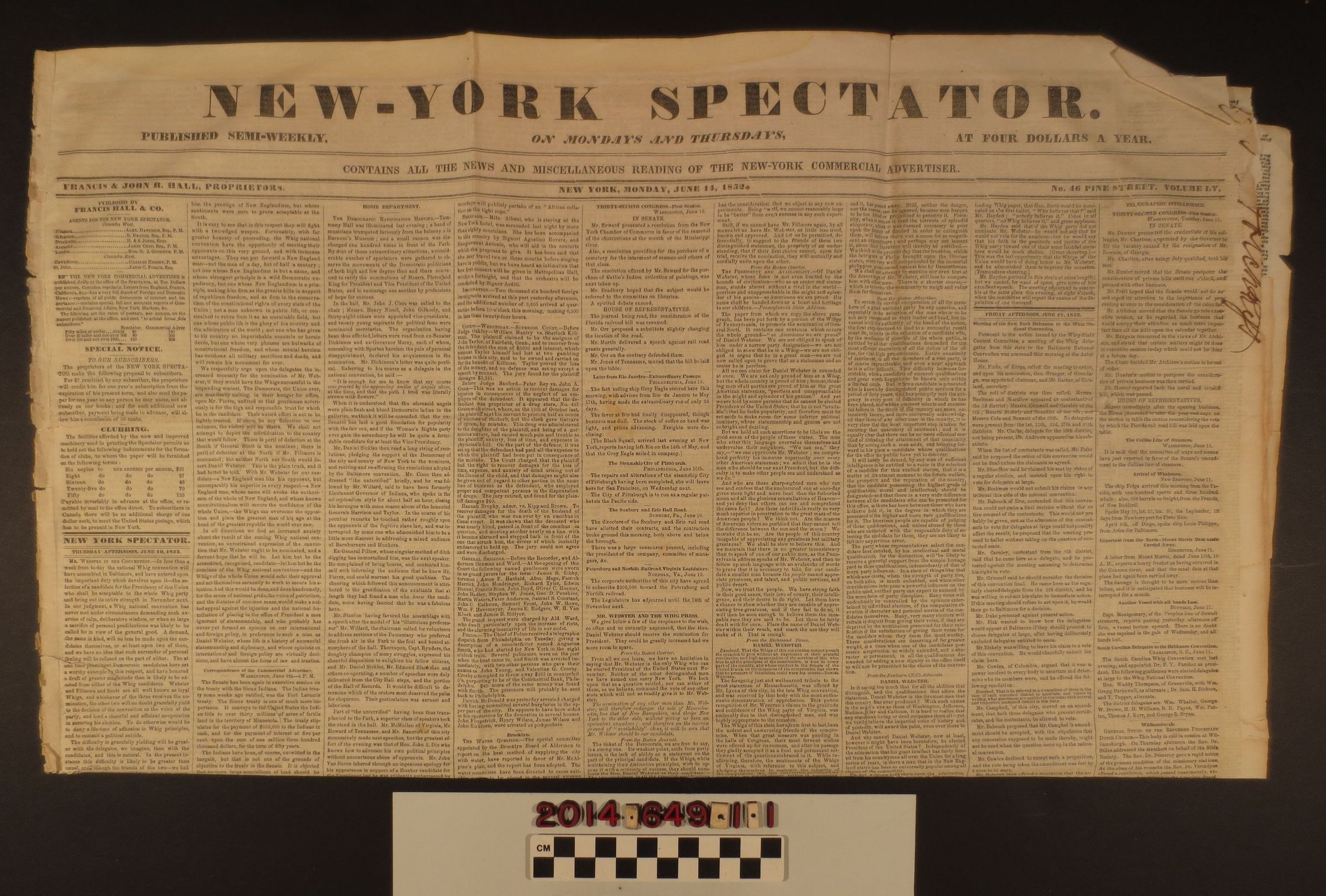 "New York Spectator," 14 June 1852. Folio newspaper features news from around the country including labor issues in the mines of California and a commodity price list for items such as metals, raw materials, drugs, dyes and foods. Other news in commercial, social, economic, political and governmental sectors. Includes advertisements. Ink inscription at top right. The newspaper was once part of a bound volume. In fair condition, minor stain at the middle, edge tears, separating pages.