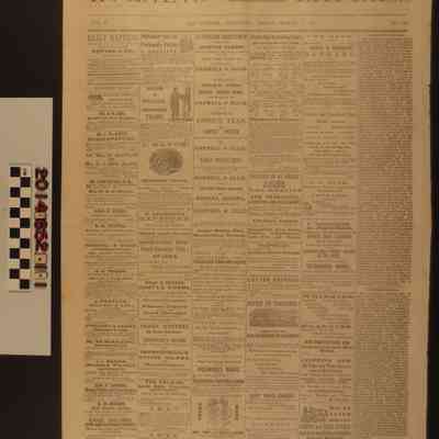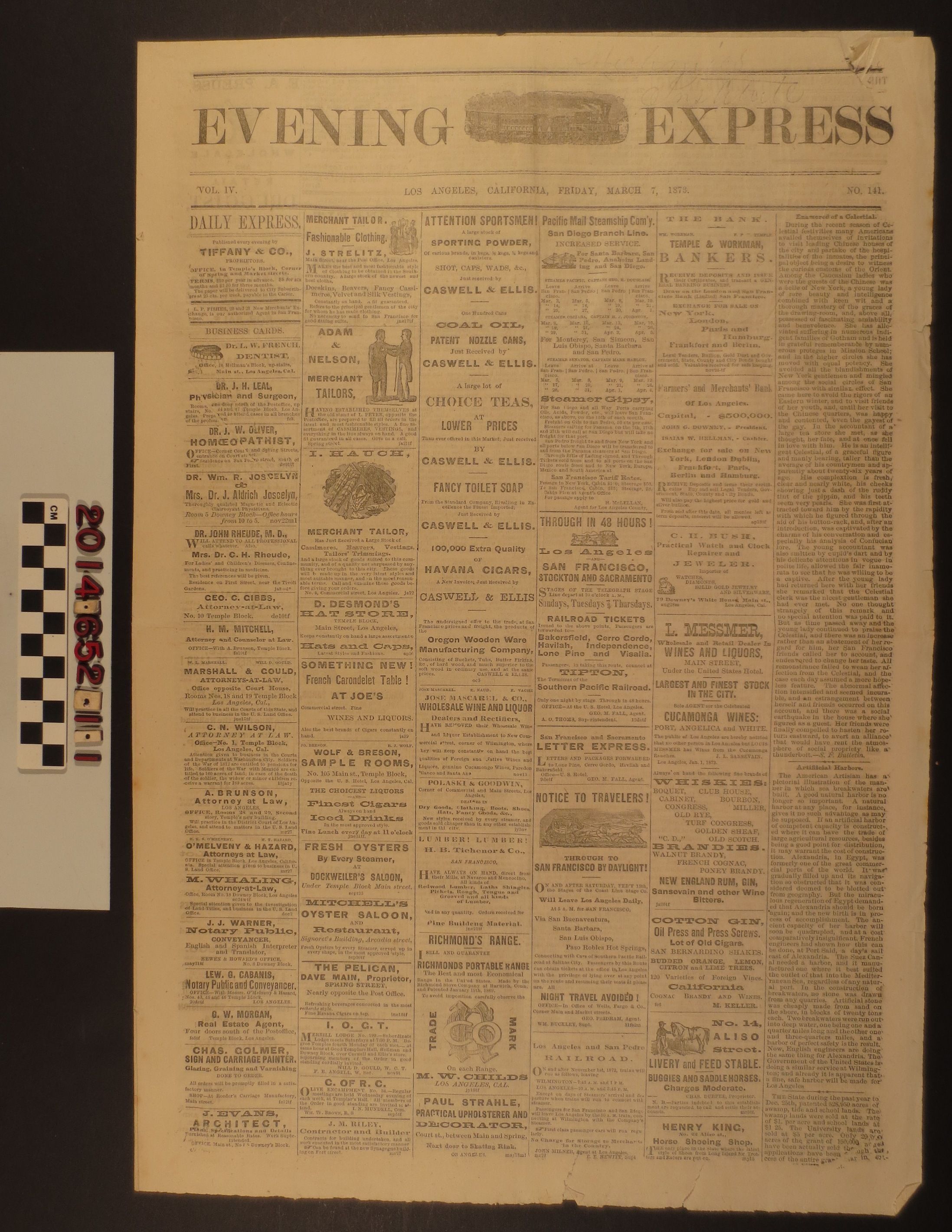 ”Los Angeles Evening Express,” 7 March 1873. A daily publication from Los Angeles featuring mostly advertisements, notices and announcements. A few short articles with eastern states and international news. An article about a Caucasian woman falling in love with a Chinese man, here termed "Celestial." The newspaper is in good condition with edge tears throughout.