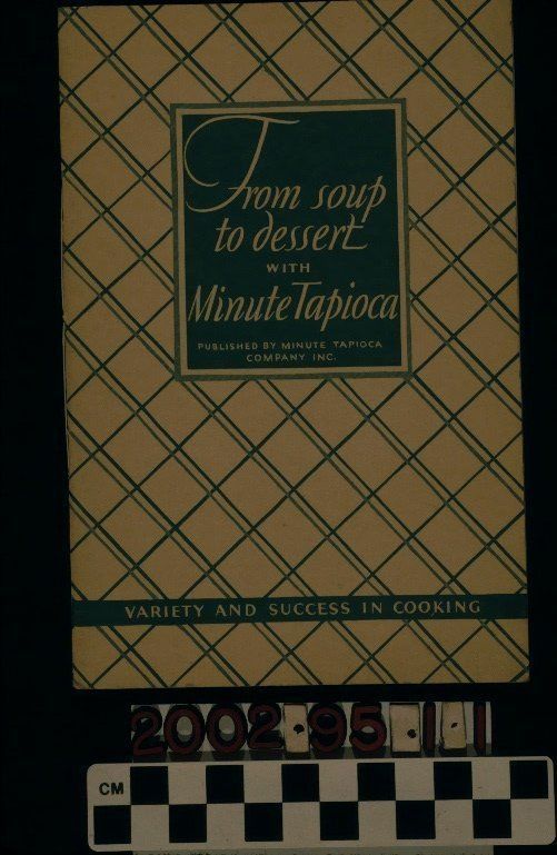 "From Soup to Dessert with Minute Tapioca," published by the Minute Tapioca Co., Inc., 1928. With 32 pages, the booklet has a yellow cardstock cover with a netting design made up of blue criss-crossed lines. At the center of the front in yellow letters, within a blue box, are the title and the name of the publisher. Within a blue bar across the bottom, also in yellow letters, is "VARIETY AND SUCCESS IN COOKING." At the beginning of the inside are a guide to the book, an introduction to the revised edition, and an introduction to the dessert recipes included. Besides recipes for desserts, such as cakes and pies, there are also recipes for soups; vegetables; fish and meat; egg and cheese dishes; and sandwiches. Also covered are other uses for tapioca, its function, its value as a carbohydrate, and its use in child-feeding. Some black and white and color illustrations are also included. There are only light creases on the cover of the artifact which is in very good condition.Lexicon
