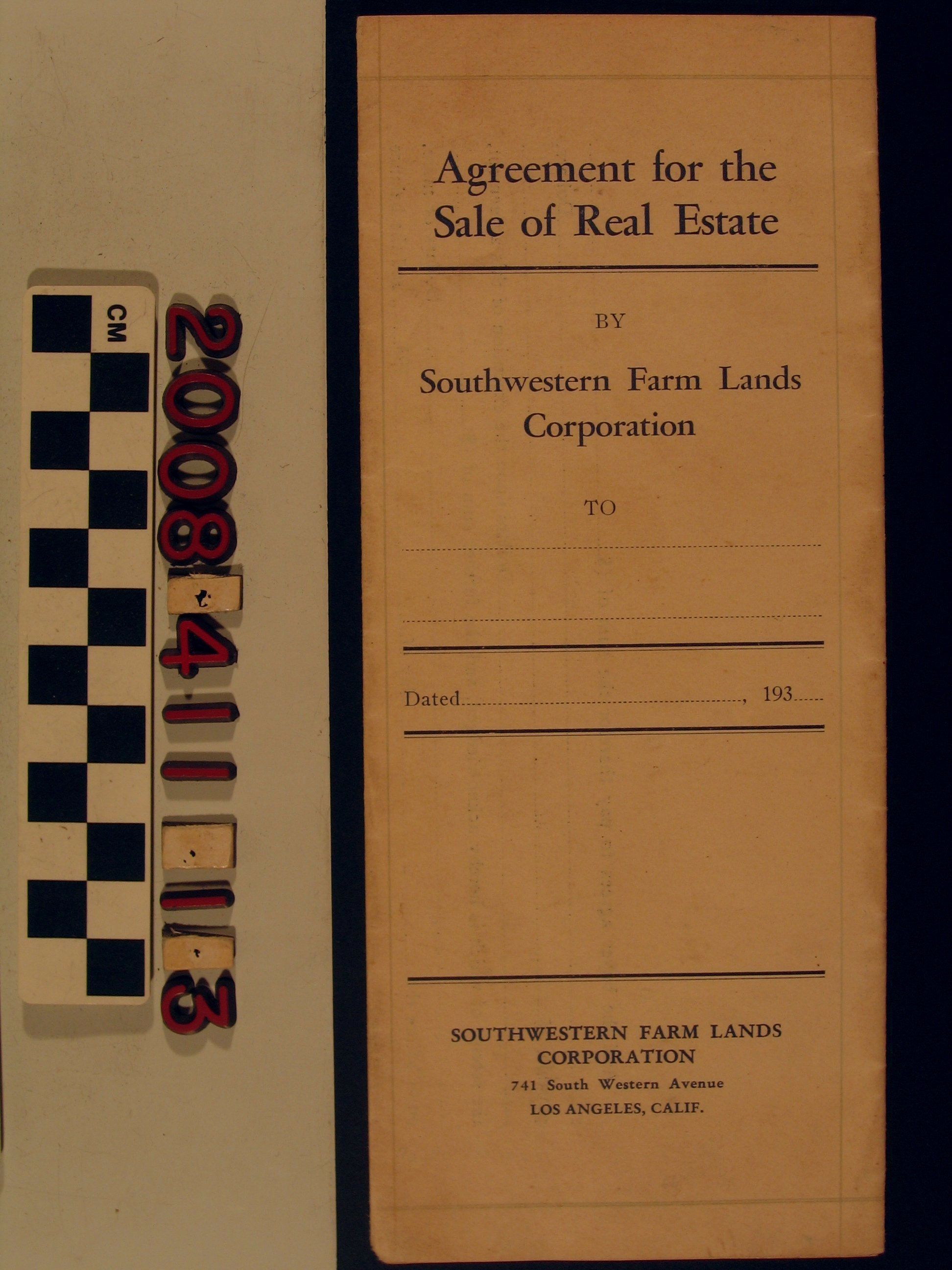 "Agreement for the Sale of Real Estate," a printed real estate contract from Southwestern Farm Lands Corporation, Los Angeles, 1930s. The unused item has standard text for the deeding of real property with spaces for names of parties, dates, descriptions of property, and others for lands in Yuma County, Arizona. With browning, soiling, some stains, creases, and edge rubbing, the condition is fair.