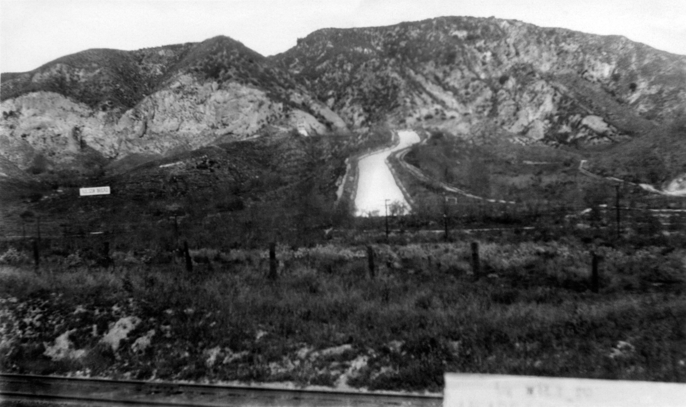 "Aqueduct @ San Fernando Road, 19 teens," ca. 1915. The image, taken from the road next to a railroad track, shows a portion of the aqueduct descending from hills. The land between the road and hills is undeveloped, although there is some fencing and dirt roads. The item is glued to black photo paper and the title is from a pencil inscription on the reverse. With little indication of wear or damage, the condition is good.Lexicon
