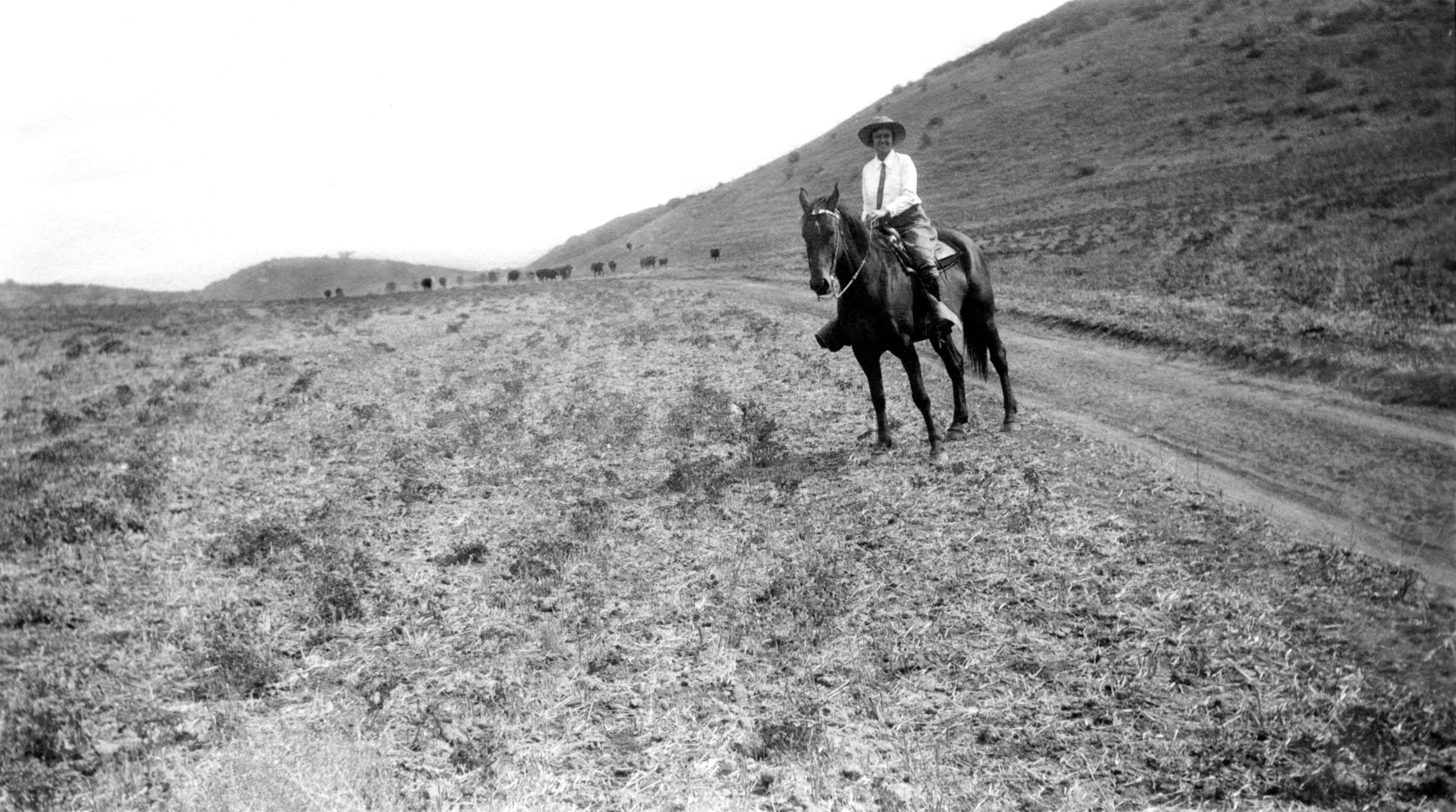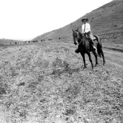 A snapshot photograph, "Josephine Scott at Rancho de Los Tres Hermanos," 16 September 1925. The image shows Ms. Scott astride a horse next to a road on the ranch and there are cattle off in the distance near some bare hills. Scott was the daughter of William Benjamin Scott, one of the "three brothers" or "tres hermanos" (along with William R. Rowland and Harry Chandler) who bought, in 194, the 2,500 acre ranch in Los Angeles and San Bernardino counties in present-day Diamond Bar and Chino Hills. Ms. Scott later married banker Roy Crocker and took ownership of the Soto-Sanchez Adobe in Montebello, which her father had purchased, and in 1972 deeded the adobe to that city. The title and date are inscribed in ink on the reverse by original owner Pauline Hoffman Herd. With some light soiling, the condition is good.