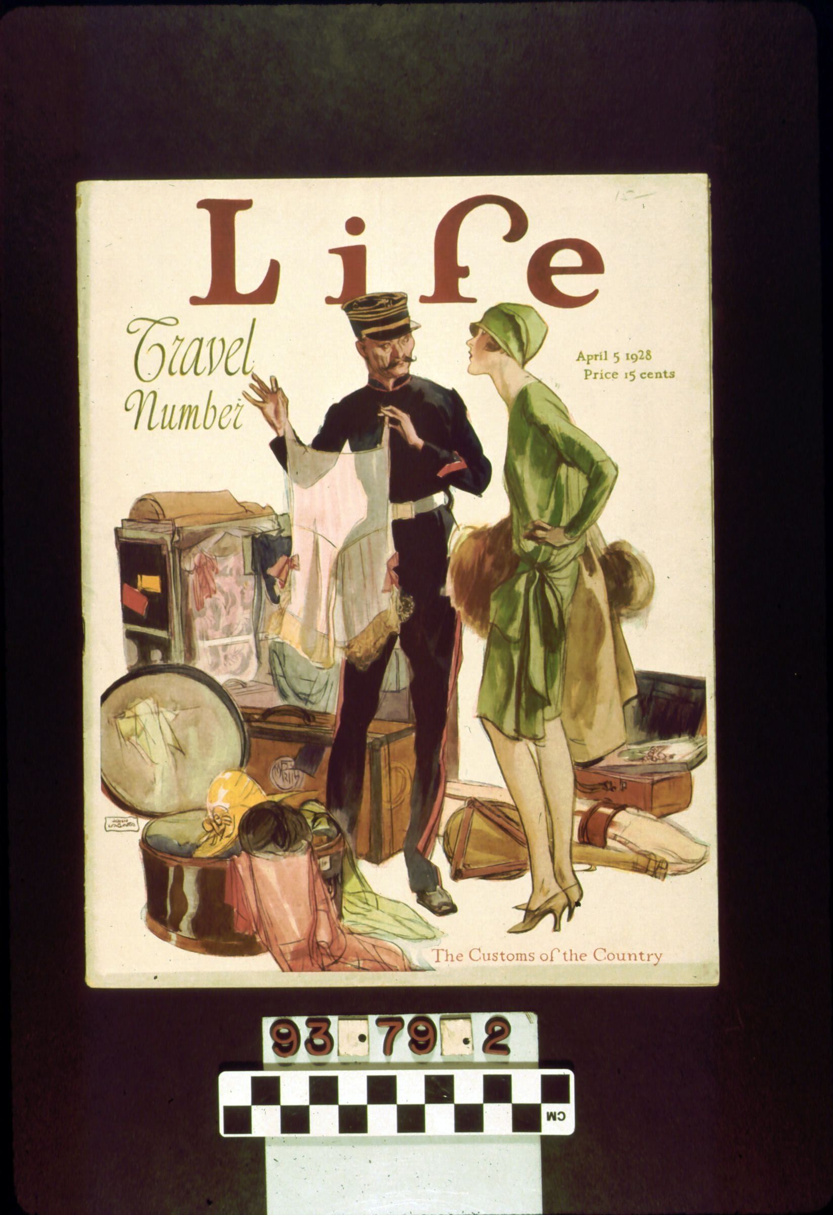 Magazine - LIFE, edited by R.E. Sherwood, New York: Life Publishing Company, April 5, 1928, Vol. 91, No. 2370, 56 pages, soft cover, front cover has illustration of customs official displaying woman's undergarment, back cover has illustrated advertisement for General Tires, two staples at spine, many illustrations, few photographs, contains articles on drama, cartoons, puns, travel. Front cover upper right corner written in pencil reads "15-".Lexicon