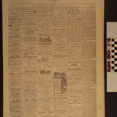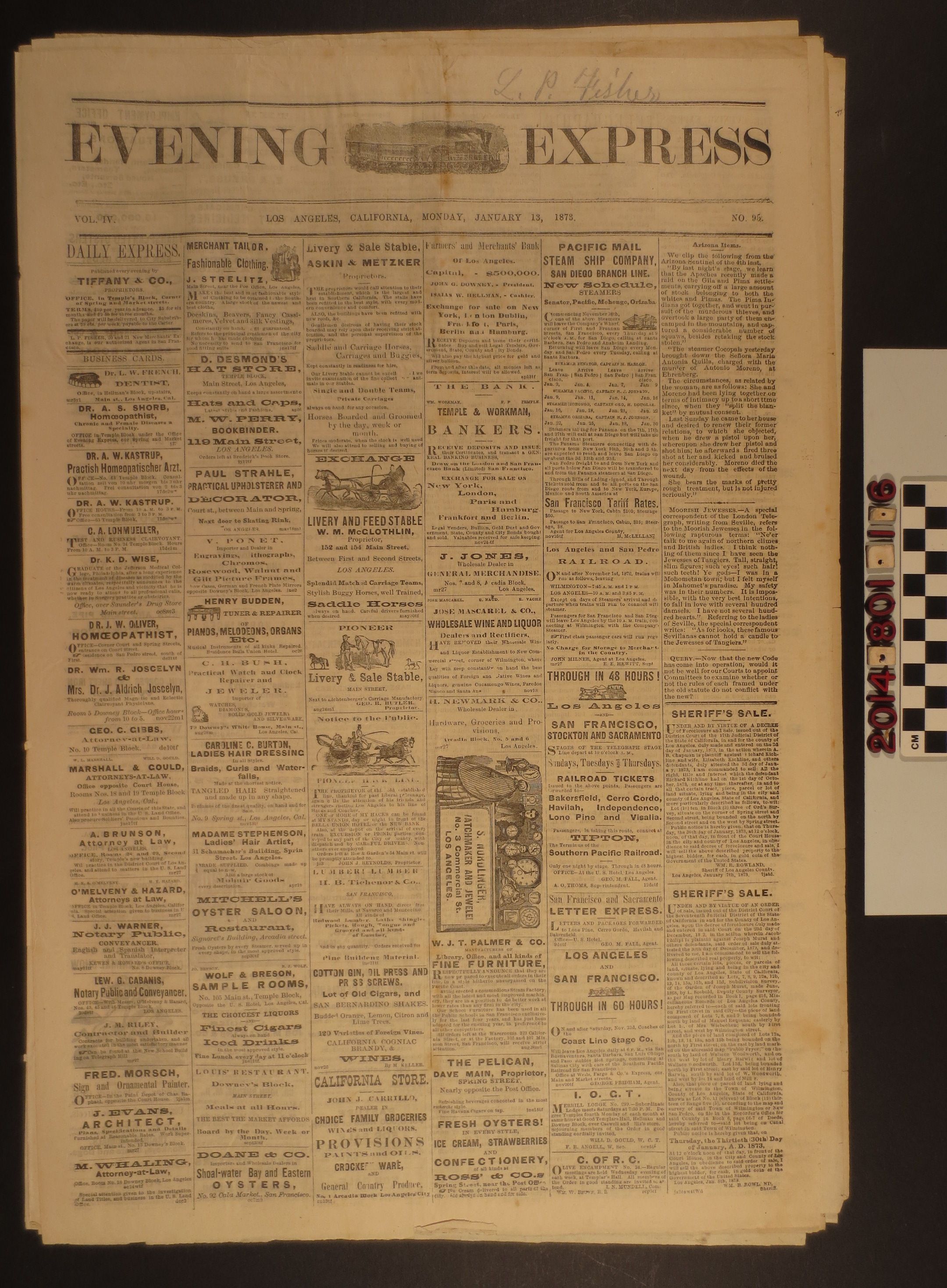 "Los Angeles Evening Express," 13 January 1873. A daily publication from Los Angeles featuring mostly advertisements (including one for the Temple and Workman Bank), notices and announcements. It also includes anecdotes from local newspapers and Sheriff's sale of lands. The newspaper is in good condition with minor creasing.