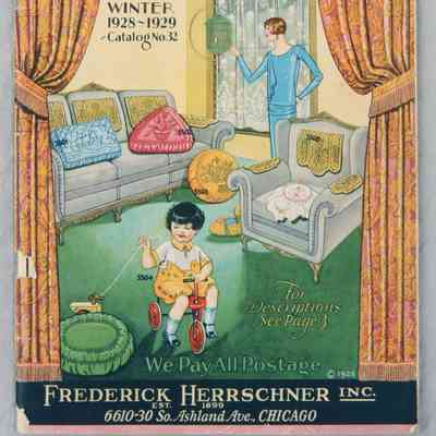 Color: Black; Blue; Green; Yellow "Art Needlework and Fancy Wear for Women and Children," a catalog for the Fall and Winter of 1928-29 issued by Frederick Herrschner Inc. The front cover has a border of draperies, drawn to reveal a drawing of a living room, within which is a woman near a birdcage and a child riding a tricycle on the carpet. Six items, including draperies, pillows and clothing have accompanying item numbers from the catalog. The title and issue number are at the top, while the company name is in a black box at the bottom. The 88-page catalog, which is number 32 in the series, has information, pricing and many color images of products sold by the company including baby clothing and linens; clothing for toddlers and children; lace edging; needlework instruction books; needles, thread, scissors, crochet hooks and other supplies; linen sets; aprons and kitchen wear; curtains; towels; pot holders; bags; dusters; table covers; pillows; tapestries; parlor and library linen sets; bedrooms linen sets; doilies; napkins; women's lingerie; handkerchiefs; and tablecloths, among others. An order form is item .2. With tears at several places on the cover and slight discoloration and wear on the pages, the artifact is in fair condition.