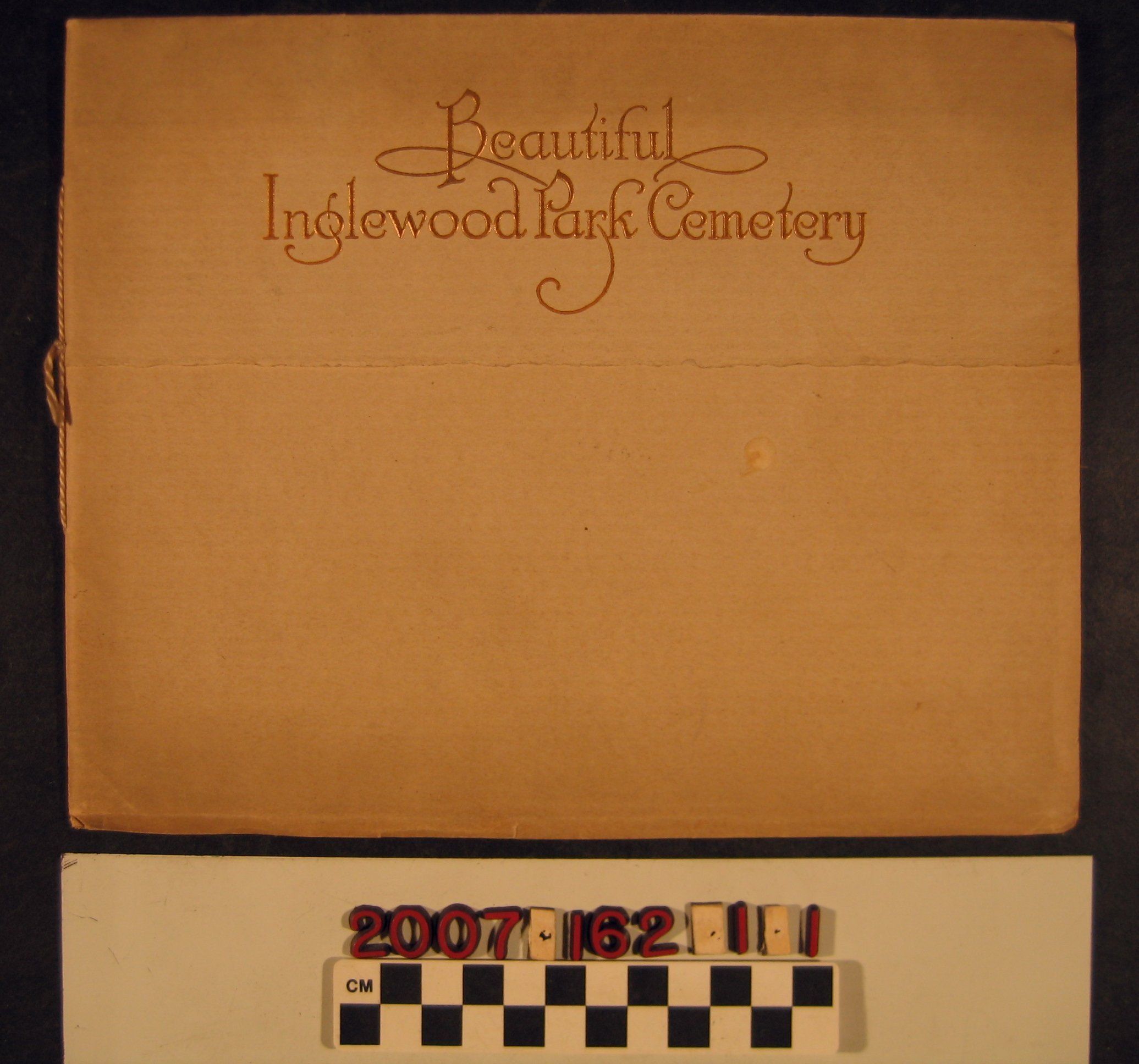 "Beautiful Inglewood Park Cemetery," published by the Inglewood Cemetery Association and printed by George Rice and Sons of Los Angeles, 1920. The item is a pictorial showing views of the cemetery, including the chapel; columbarium; headstones; mausolea; statuary; the superintendent's home; a centerfold panorama of the site; the crematorium; and a drawing of a proposed memorial. There is information on the cemetery and a list of officers, directors, and office information at the back. There is shadowing, edge tears and wear, soiling, and stains on the wrapper, but the pages are clean, so the overall condition is good.Lexicon