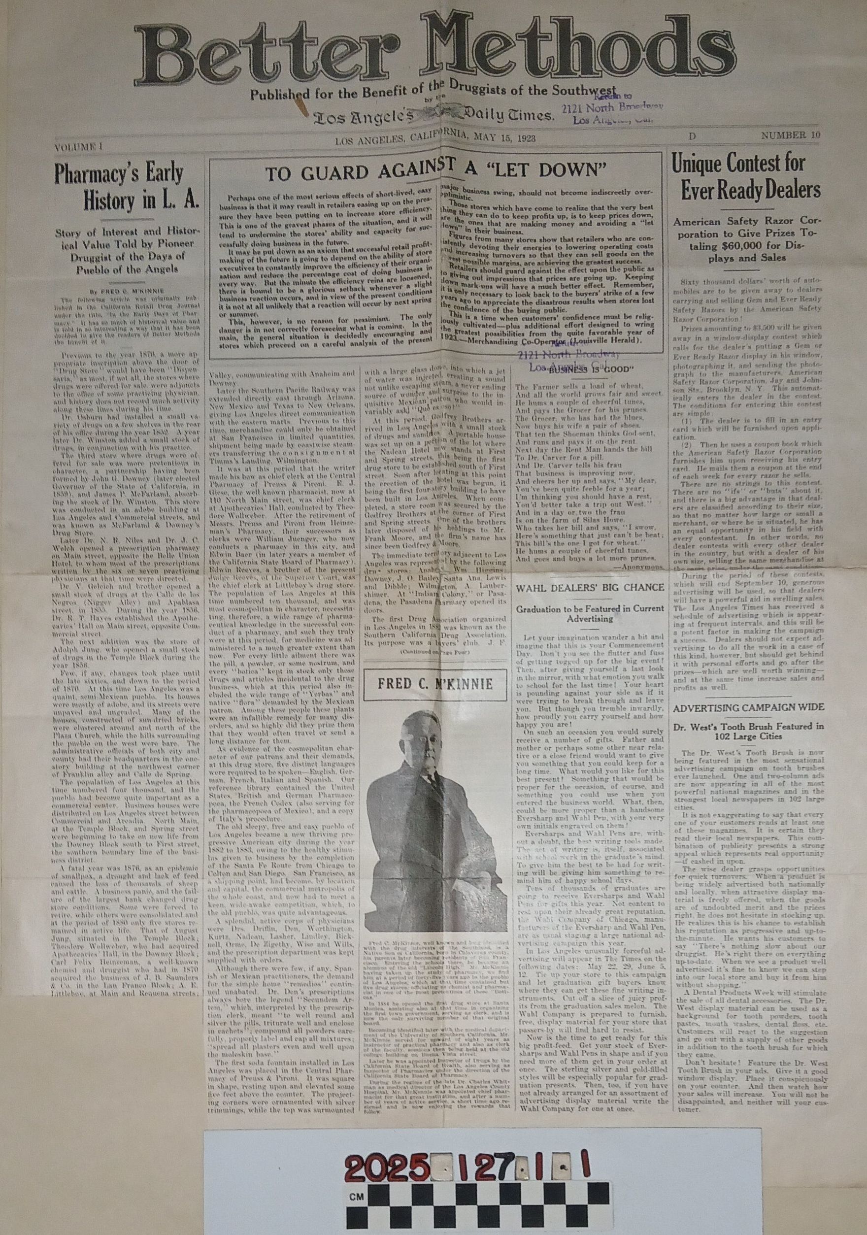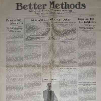 "Better Methods," Los Angeles Times, 15 May 1923. This tenth number of the first volume by the newspaper "for the benefit of the druggists of the Southwest" includes articles, editorials and advertisements related to the pharmacy industry in the region. A major feature is "Pharmacy's Early History in L.A.," though a section is lost to a clipped area at the bottom of the first column. With folds, creases, a stain or two and light soiling, the condition is good.