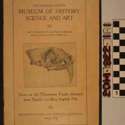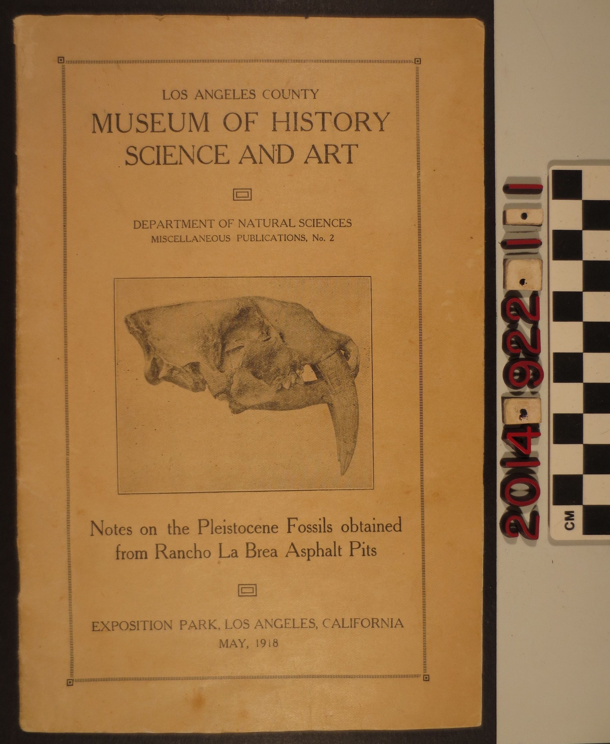 "Notes on the Pleistocene Fossils obtained from Rancho La Brea Asphalt Pits," Exposition Park, May 1918. A publication from the Los Angeles County Museum of History, Science and Art, Department of Natural Sciences. A pamphlet detailing the excavation, research work and findings at Rancho La Brea. Includes illustrations and photographs. The pamphlet is in good condition with moderate surface soiling and minor creasing.