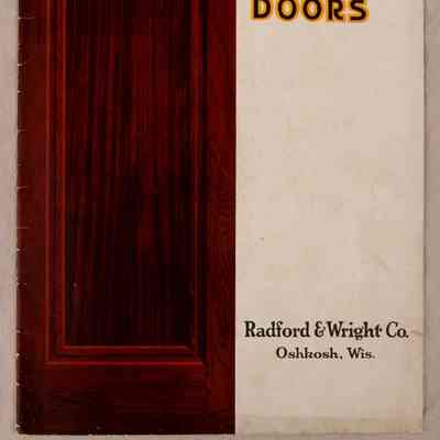 "Radford Doors", a catalog issued by the Radford & Wright Company, 1926. The 16-page booklet has an image of a dark brown door on the left side of the front, with the catalog name in brown and yellow at the upper right and the company name and city of business at the lower right. The inside of the front cover is a statement on the doors and wood products offered by the company and the first page is a longer description of the company and its products. This is followed by color-drawn samples of the Aristocrat and Pilgrim lines of doors, giving the type of wood for the door and trim and the finish, as well as available finish options. Line drawings of household scenes accompany these descriptions. Page 7 shows a section view of a door to demonstrate the quality construction and gives dimensions of Aristocrat doors. Pages 8-9 constitutes a fuller promotion for the Aristocrat line of doors with promotions of its features. There is also a section view of the Pilgrim door on page 14, but no full-sized promotional section as with the Aristocrat. Page 15 shows a variety of veneered doors, which were cheaper and of lesser quality than those doors shown earlier, while the following page shows Aristocraft and Pilgrim french, front and mirrored doors. The inside back cover is an advertisement for the built-in woodwork catalog available from the company and has a color image of a built-in dining nook. With some fairly extensive surface soiling, a few creases and some small stains on the cover with creases and some soiling on the pages, the artifact is in fair condition.Lexicon