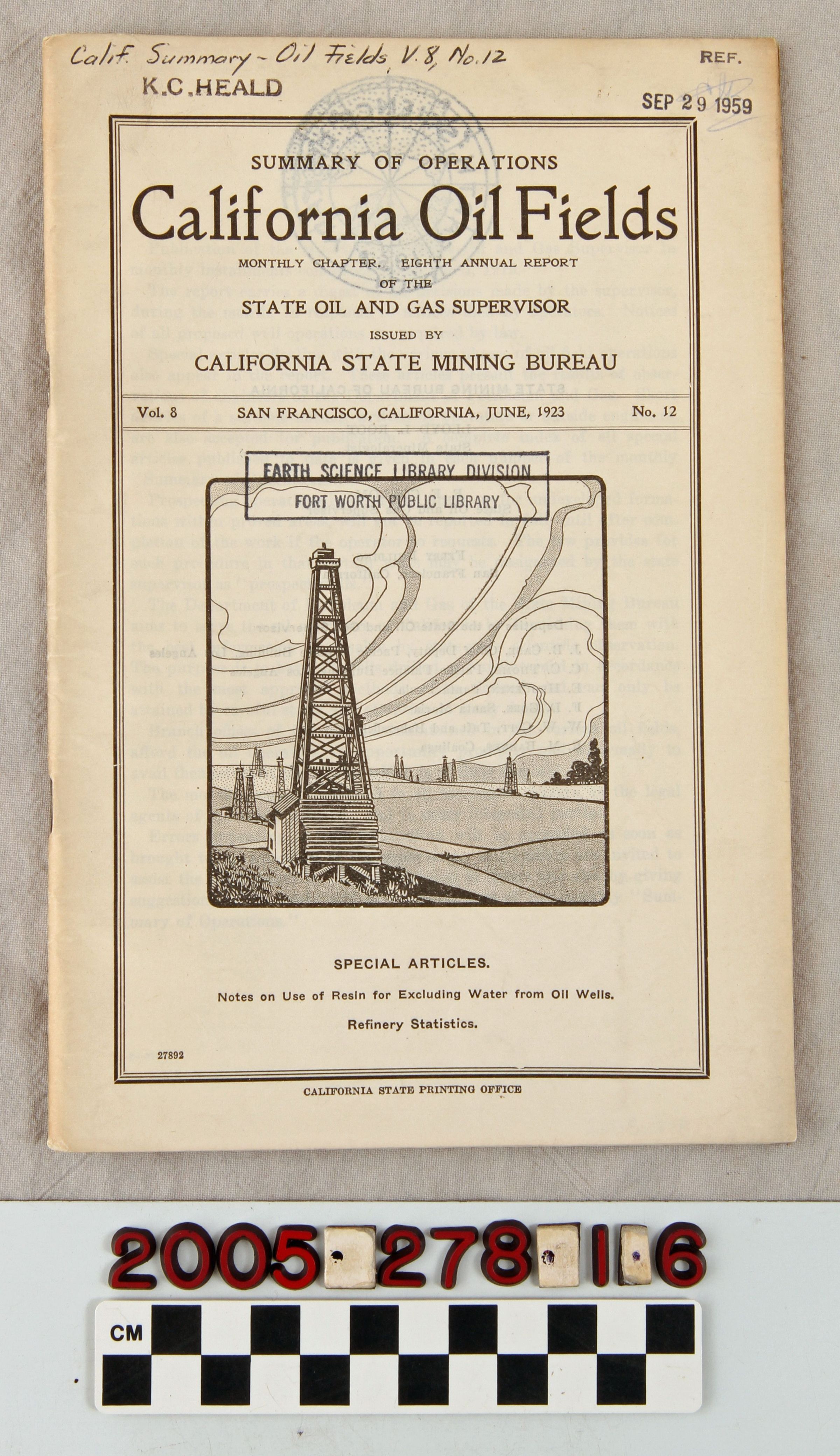REPORT, "SUMMARY OF OPERATIONS, CALIFORNIA OIL FIELDS," June 1923. In fair condition.Lexicon