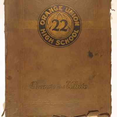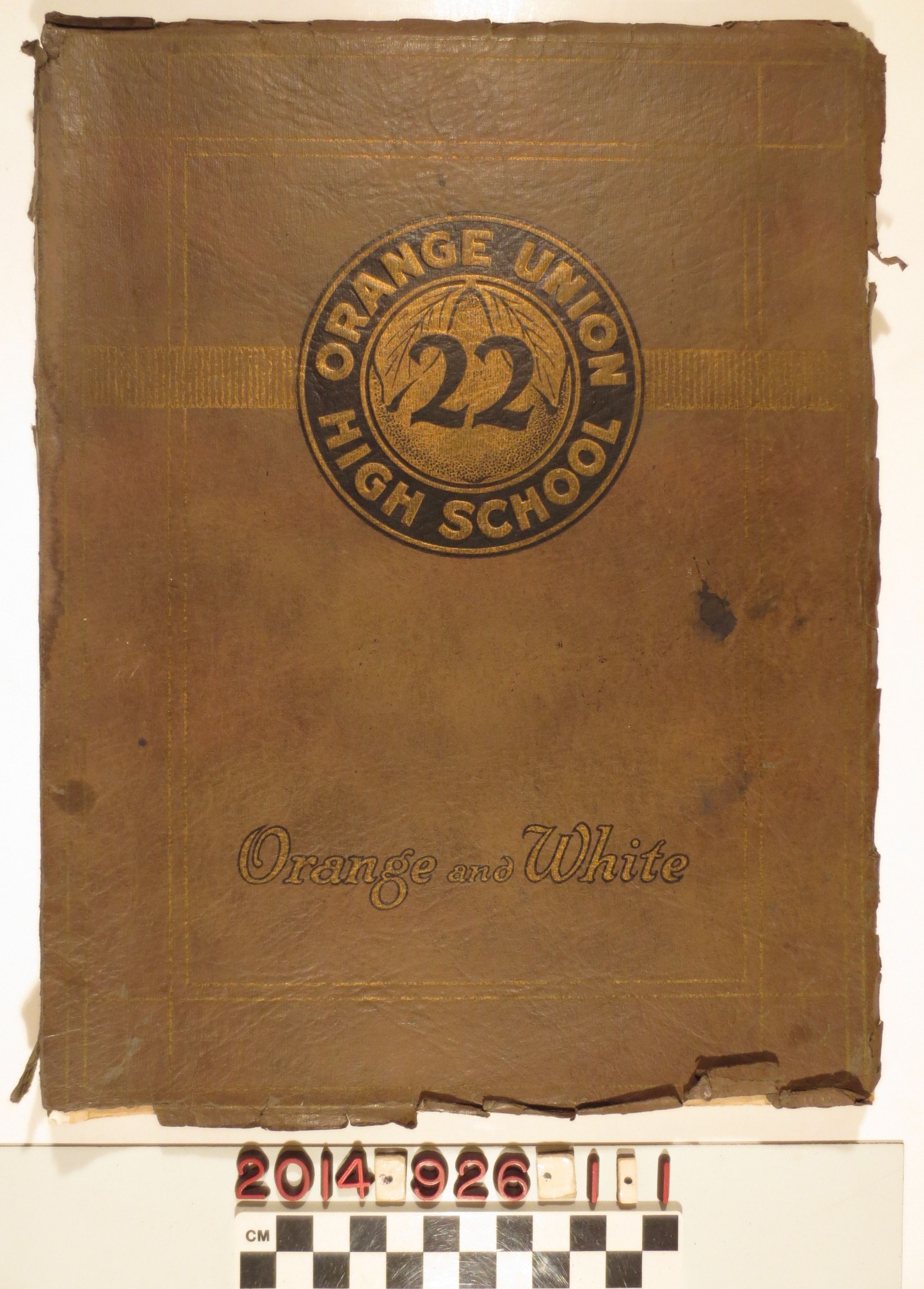 "Orange and White," Orange Union High School yearbook, 1922. A brown, softbound book with the school name and logo embossed on the front cover. The yearbook includes photographs and names of the students, staff and faculty. Students have contributed materials such as stories, poetry and dedications. Also includes lists and photographs of clubs and school organizations. The book is in fair condition with a fragile cover, edge tears and creasing.