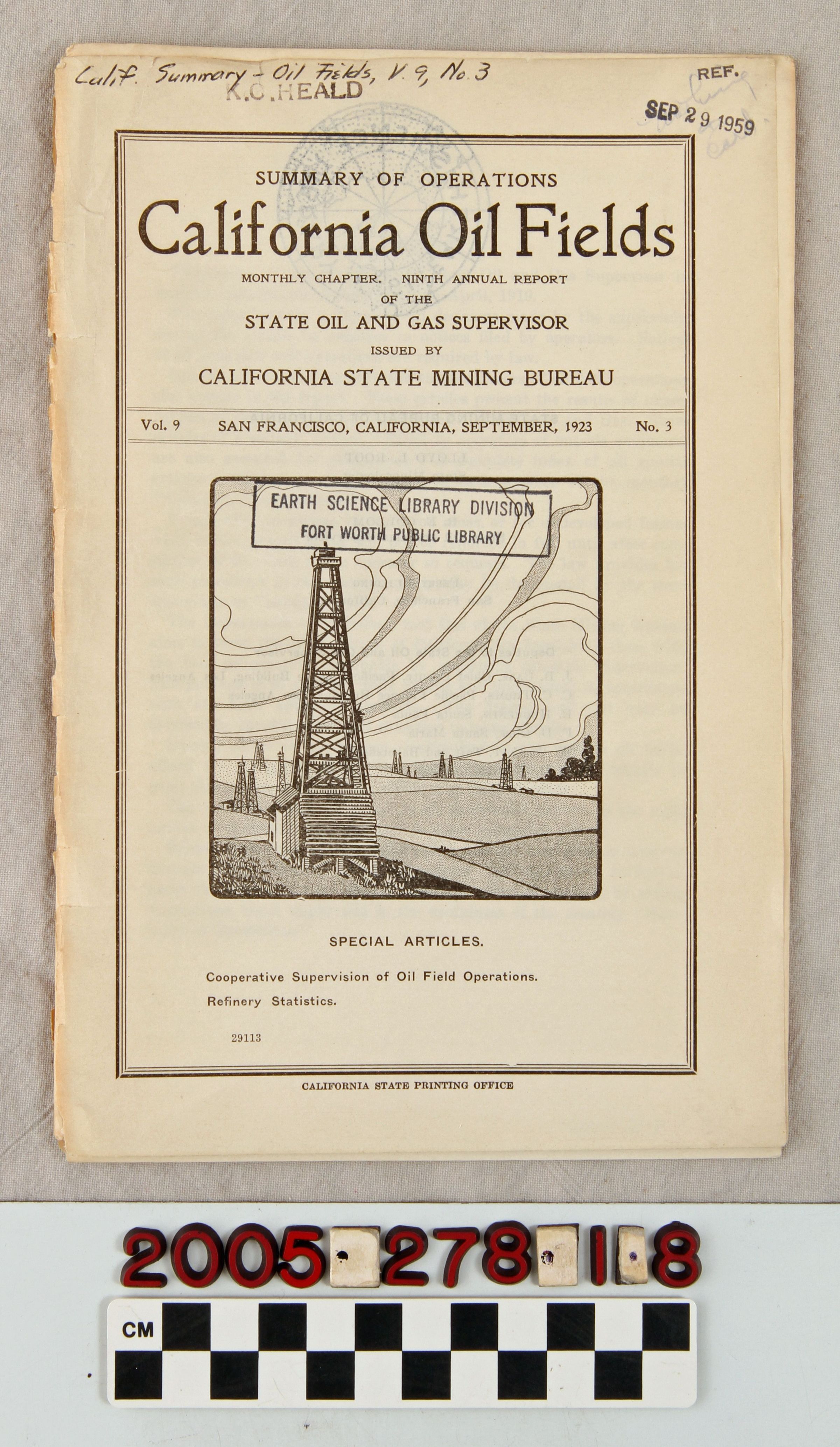 REPORT, "SUMMARY OF OPERATIONS, CALIFORNIA OIL FIELDS," September 1923. In fair condition.Lexicon