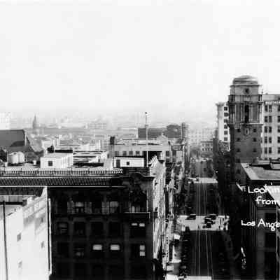 Photograph, "Looking east on 2nd Street from top of 2nd Street Tunnel," Los Angeles, ca. 1920. The image shows an elevated view of 2nd Street. Visible are the rooftops of buildings along the street including Southern California Edison Company to the right and the Douglas Building to the left. Automobiles are parked and driving in the street below. The photo is in good condition with only minor warping.