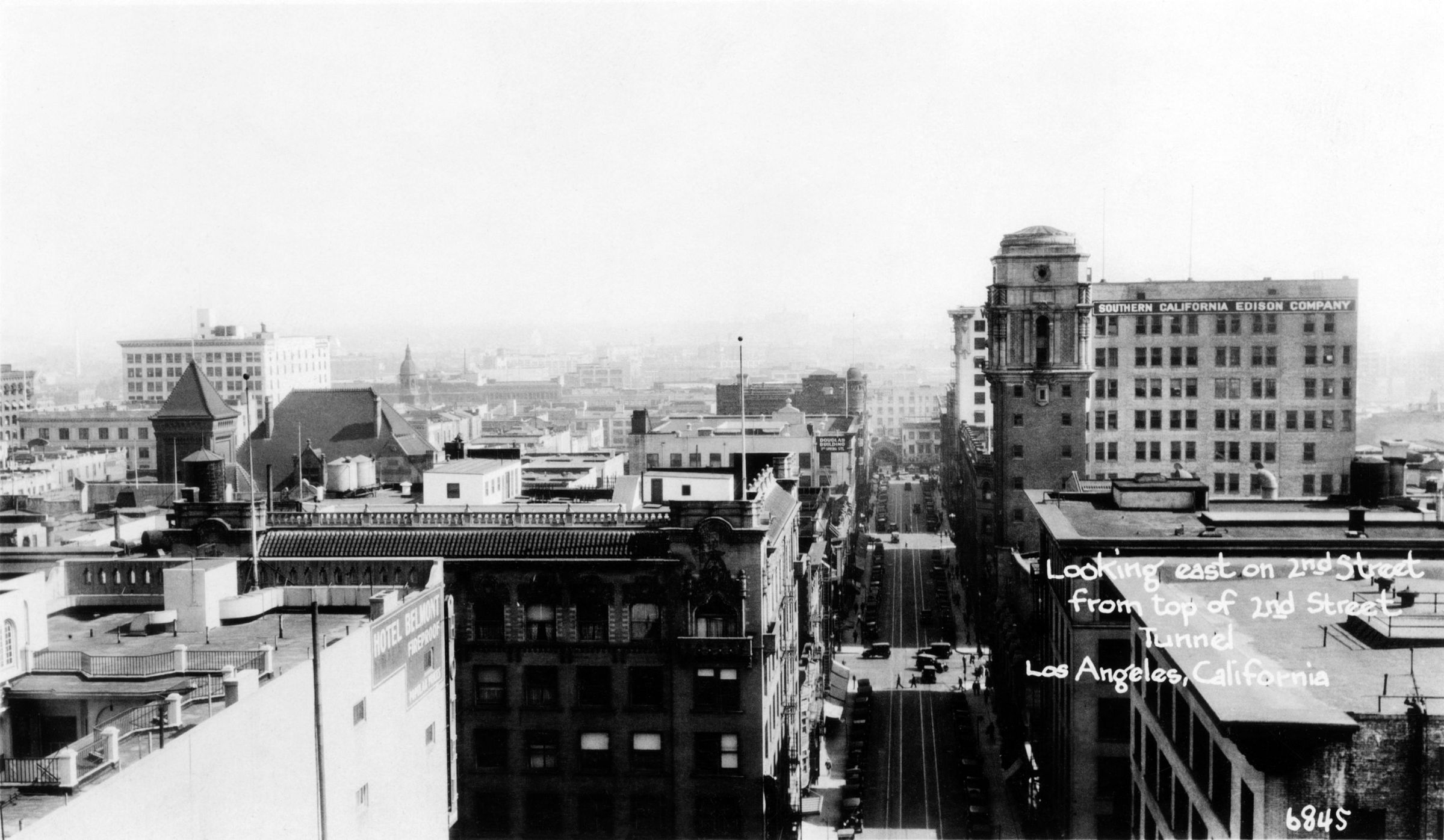 "Looking east on 2nd Street from top of 2nd Street Tunnel" Los Angeles, ca. 1920.Entry/Object ID