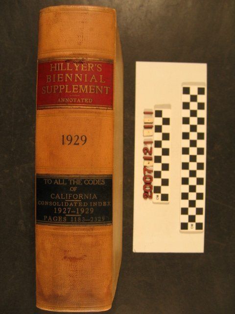 "Biennial Supplement to the Codes of the State of California," compiled and annotated by Curtis Hillyer (San Francisco: Bender-Moss Company,) 1930. The work compiles changes to the codes from the 1929 session of the state legislature with references to the two previous editions of the work from 1921 and 1925. There is a table of code sections referring to added, amended and repealed statutes; annotated sections from the codes of Montana (1921) and Idaho (1919); then the specific annotated codes broken down by type, such as political, civil, code of civil procedure, and the penal code; and a consolidated index to the 1927 and 1929 supplements. With much soiling, stains, and edge rubbing to the boards, a slightly loose binding, but generally clean pages, the condition is fair.Lexicon