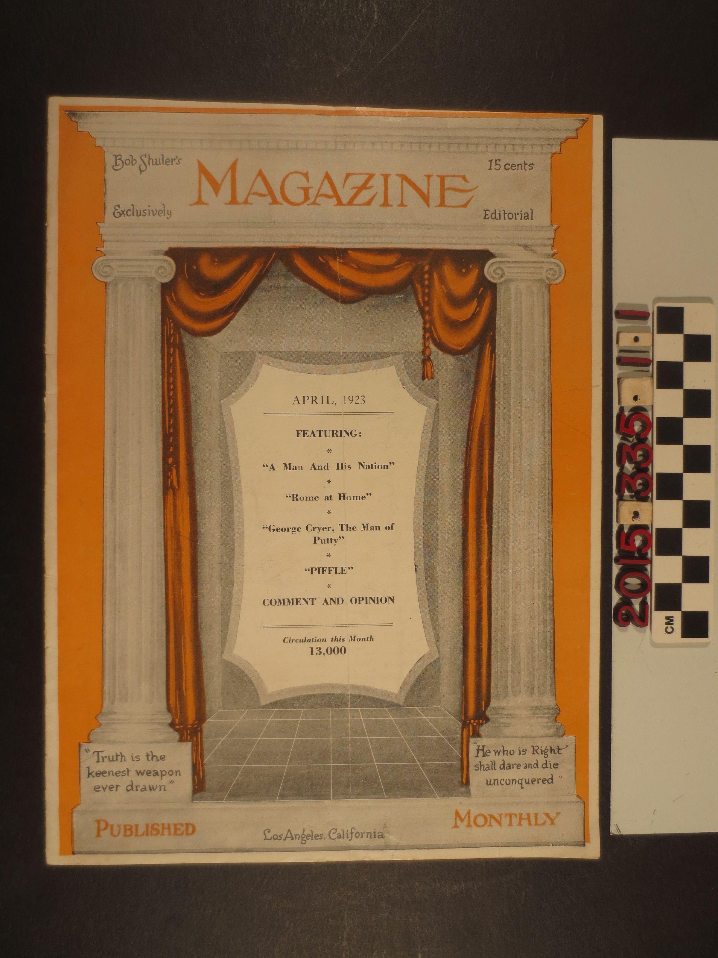 "Bob Shuler's Magazine," April 1923. Published in Los Angeles, the magazine features articles on religion, education, civic, social and moral reform. Some articles are adapted for print from radio programs. It also includes local business advertisements. The magazine is in good condition overall.