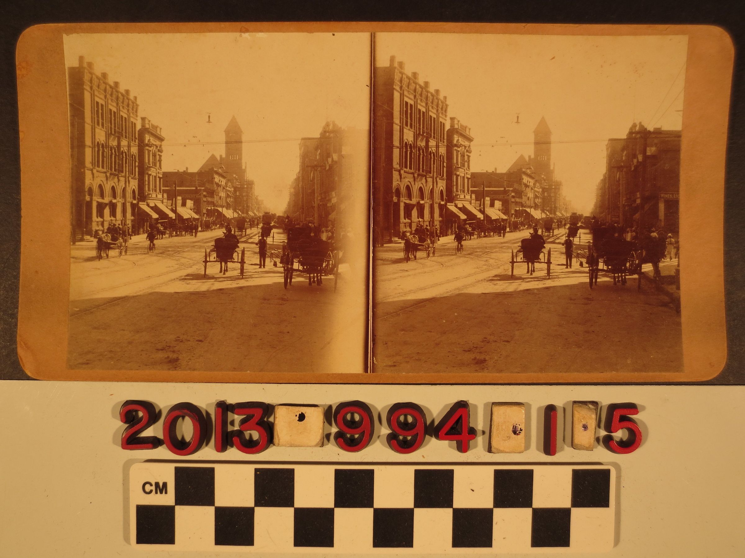 "Broadway, Los Angeles," Adolf Freese, ca. 1900s. The view is from the west side of the street at about First and looks south. Pedestrians, horse-drawn vehicles, commercial buildings from two to about four stories, streetcars and tracks, and power lines and poles are notable. City Hall, with its distinctive clock tower, is down the street and at the left. The title is written in ink on the reverse. With minor soiling on the image, soiling and small stains, as well as abrasions on the mount, moderate fading, the overall condition is good.Lexicon