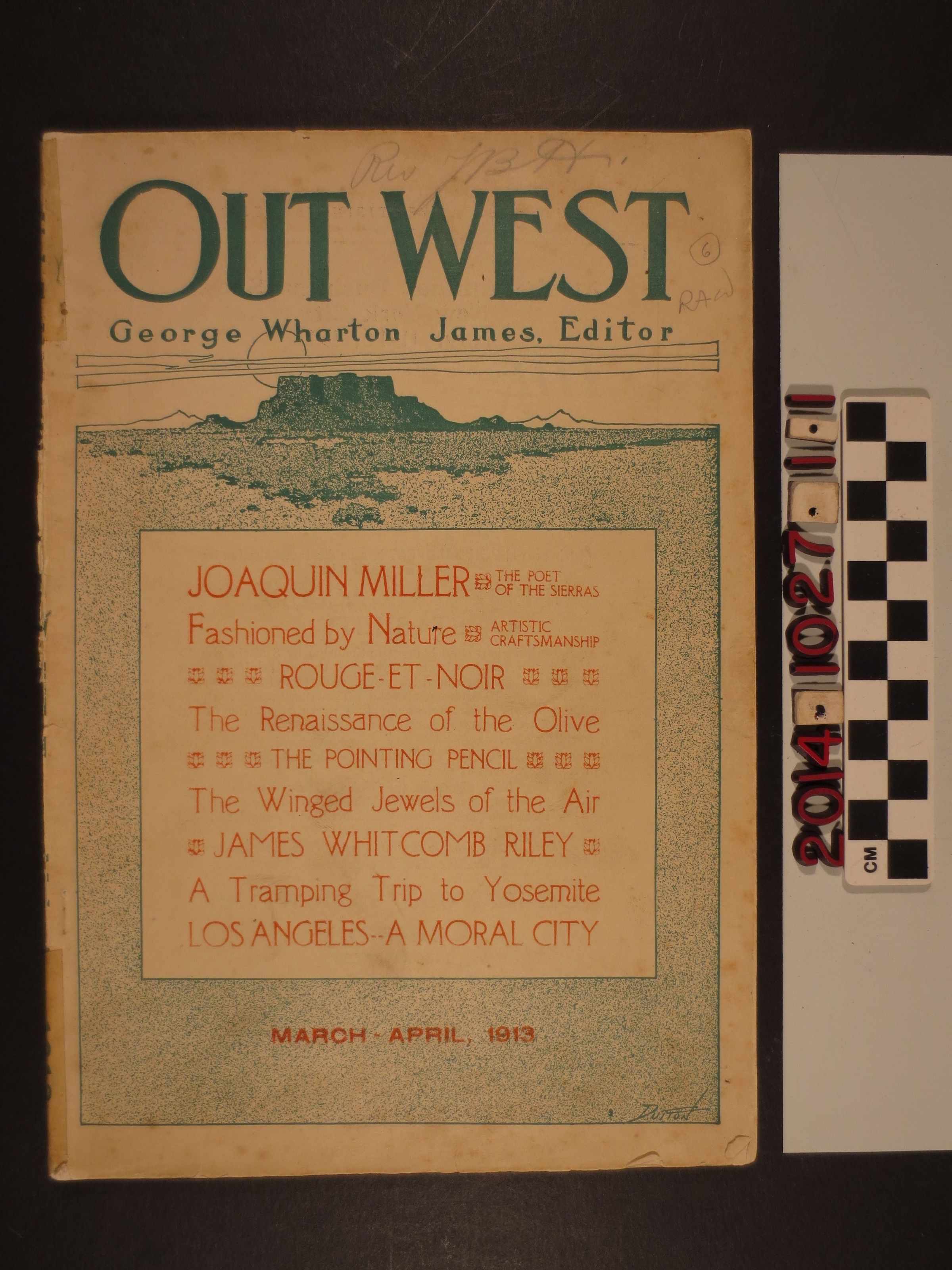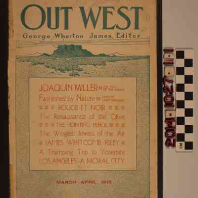 "Out West," March - April 1913. The publication includes poetry, fiction and articles about current events. Features an article about rustic furniture and structures made of raw wood and stone; an article about the agriculture of olives in California; an article about Yosemite Valley. The publications is illustrated with cartoon drawings and photographs. It also includes local advertisements. The magazine is in fair condition with a tearing spine, foxing to the cover and general surface soiling.Lexicon
