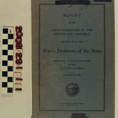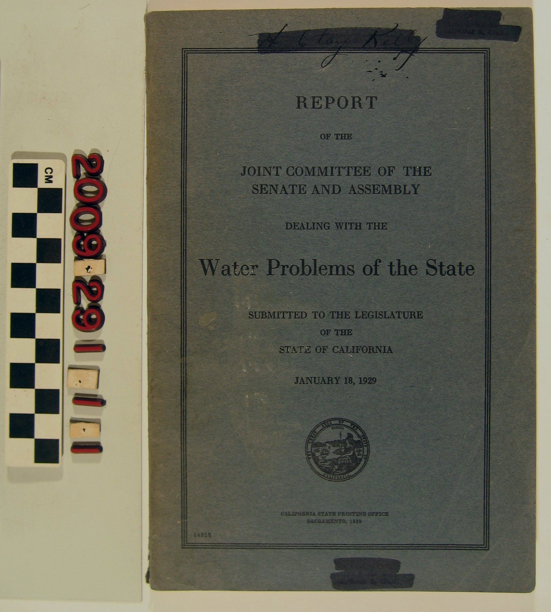 "Report of the Joint Committee of the Senate and Assembly Dealing with the Water Problems of the State," 18 January 1929, published by the California State Printing Office. Sections deal with reservoirs, water use and conservation, hydroelectric power, irrigation and other issues. With stains, soiling, tears and creases on wrappers, but clean pages, the overall condition is good.Lexicon
