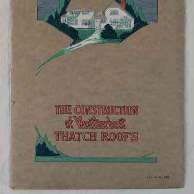 Color: Brown; Green; Orange; Purple "The Construction of Weatherbest Thatch Roofs," a catalog issued by the Weatherbest Stained Shingle Co., Inc, 1928. The 24-page catalog has a brown paper cover with the front containing a color image at the top of a home with a thatch roof. Toward the bottom is the title of the publication in orange letters with a landscape scene underneath. At the upper right and lower right are printed inscriptions reading "A. I. A. File No. 19d1." On the center of the back cover is the product name on a green banner or shield. The printer's name, Russell Printing Co., Inc of Buffalo, New York, is at the lower right. After the copyright and title pages is a description of English thatched straw roofs, which the company emulated with its product, which is described on pages seven and nine. Other elements of the text are specifications; construction of the roofs with architectural drawings accompanying the descriptions; and the laying of the shingles with drawings of the process. There are black and white photographs of houses that have Weatherbest roofs on them, while the drawing from the front cover is repeated throughout. While there are some acid stains and creases on pagesand a few small stains, a tear at the left front, creases and dented corners on the covers, the artifact is in good condition.