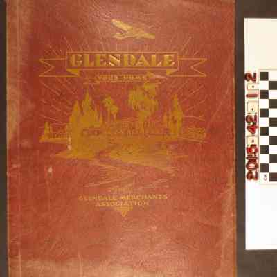 "Glendale Your Home," presented by Glendale Merchants Association, 1928. A soft bound volume advertising Glendale as a city. Includes Glendale history, pioneers such as the Verdugo family, photographs around the city, advertisements, Glendale High School history, residences and a list of members of the Merchants Association. The book is in fair condition with moderate surface soiling throughout and minor stains due to water damage to the covers.