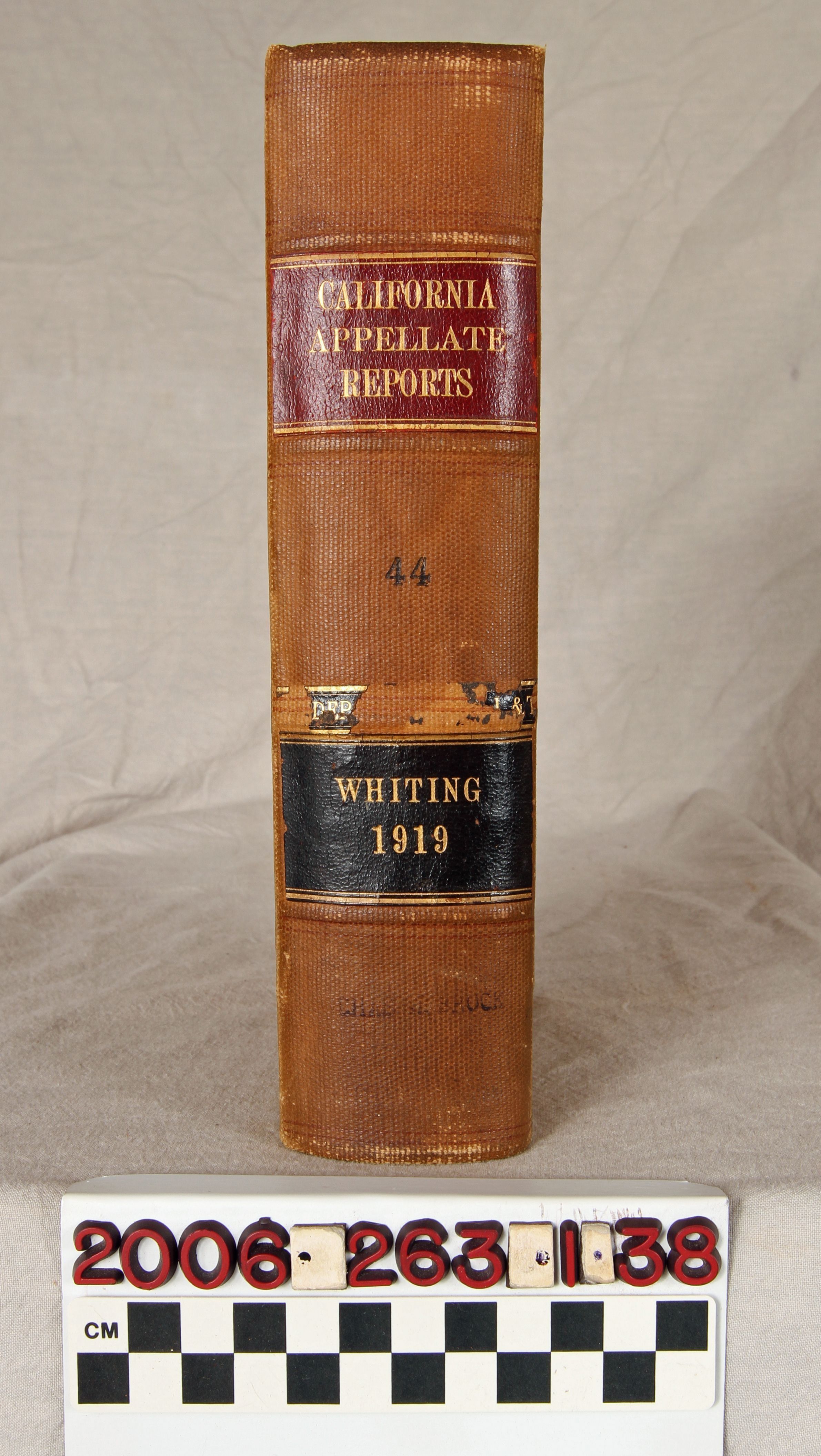 "California Appellate Reports," Volume 44, 1919 (San Francisco: Bancroft-Whitney Company,) 1920. The work contains the reported cases, as well as a list of justices and officers, tables of cases reported and not reported, a table of cited cases, a statute of code citations, and an index . The covers have rubbing, abrasions, scratches, and soiling, while the pages are relatively clean and tight, so the general condition is fair.Lexicon