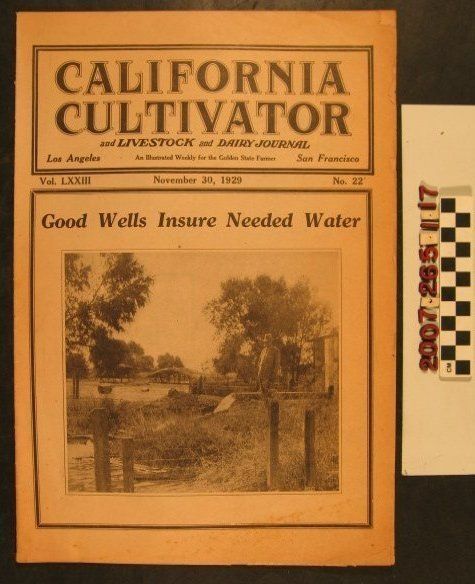 "California Cultivator," 30 November 1929 (Vol. LXXIII, No. 22), published by Cultivator Publishing Company, Inc, Los Angeles. The item covers the farming, livestock, and dairy industries and has some photographs as illustrations as well as industry-related advertisements. With foxing, browning, and edge tears on the wrappers and pages browned, the condition is fair.Lexicon