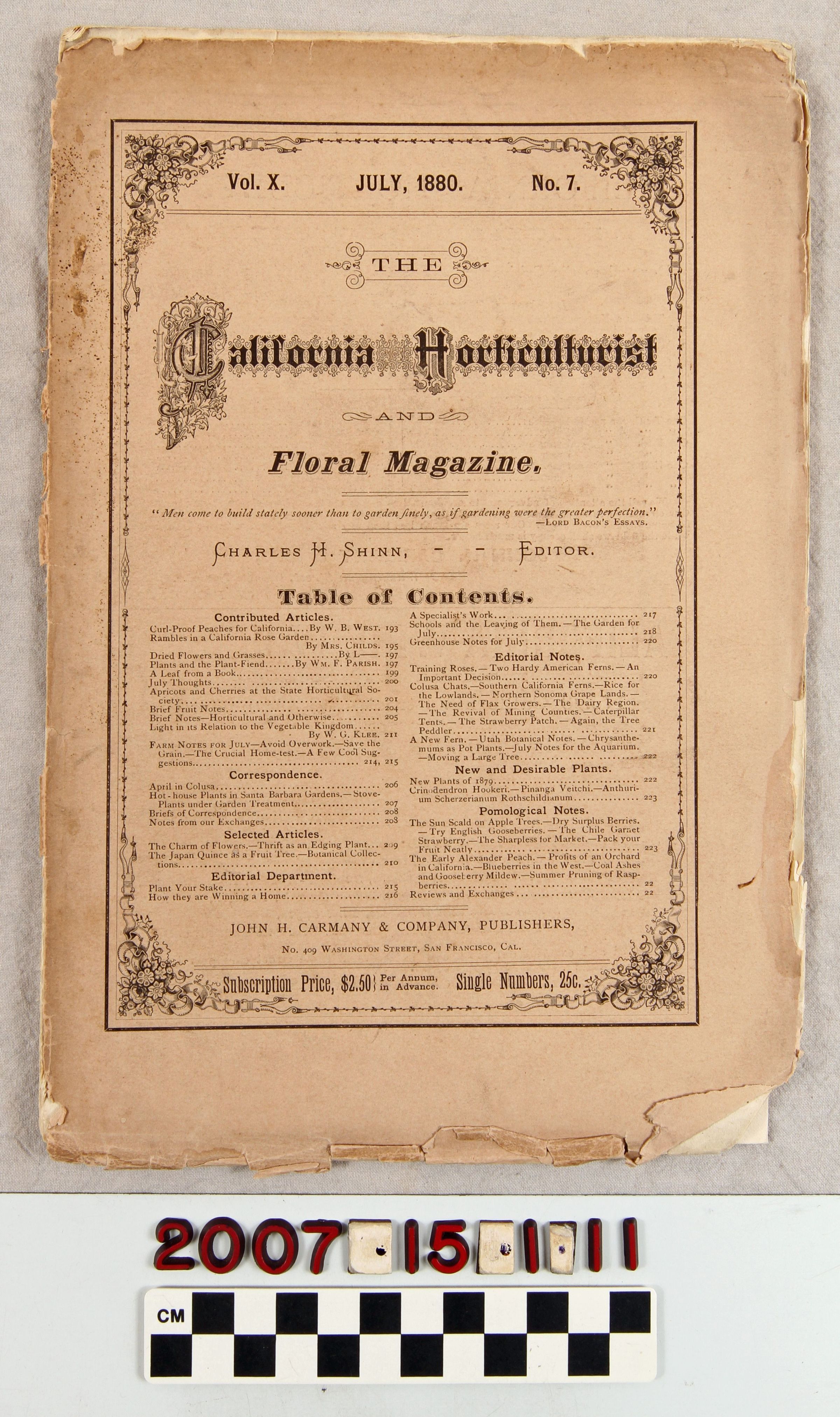 "California Horticulturist and Floral Magazine," Vol. X, No. 7 (July 1880), published by John H. Carmany & Co., San Francisco. The periodical is a general magazine for farming, landscape gardening, and related topics and has sections on "Contributed Articles"; "Correspondence"; "Selected Articles"; "Editorial Department"; "Editorial Notes"; "Pomological Notes"; and "New and Desirable Plants." There are also advertisements. The back wrapper is missing and the front has many tears, some missing portions, heavy creasing, soiling and staining, and other wear, while pages are dogeared, torn, and creased, so the condition is poor.Lexicon