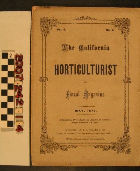 "California Horticulturist and Floral Magazine," Vol. 2, No. 6 (May 1872), published by F.A. Miller & Co., San Francisco. The periodical is a general magazine for farming, landscape gardening, and related topics, consisting of articles, essays, reprinted items from other publications, and advertisements. The wrappers are intact, but have much soiling, tears, and other wear. Pages are generally clean, so that the overall condition is poor.