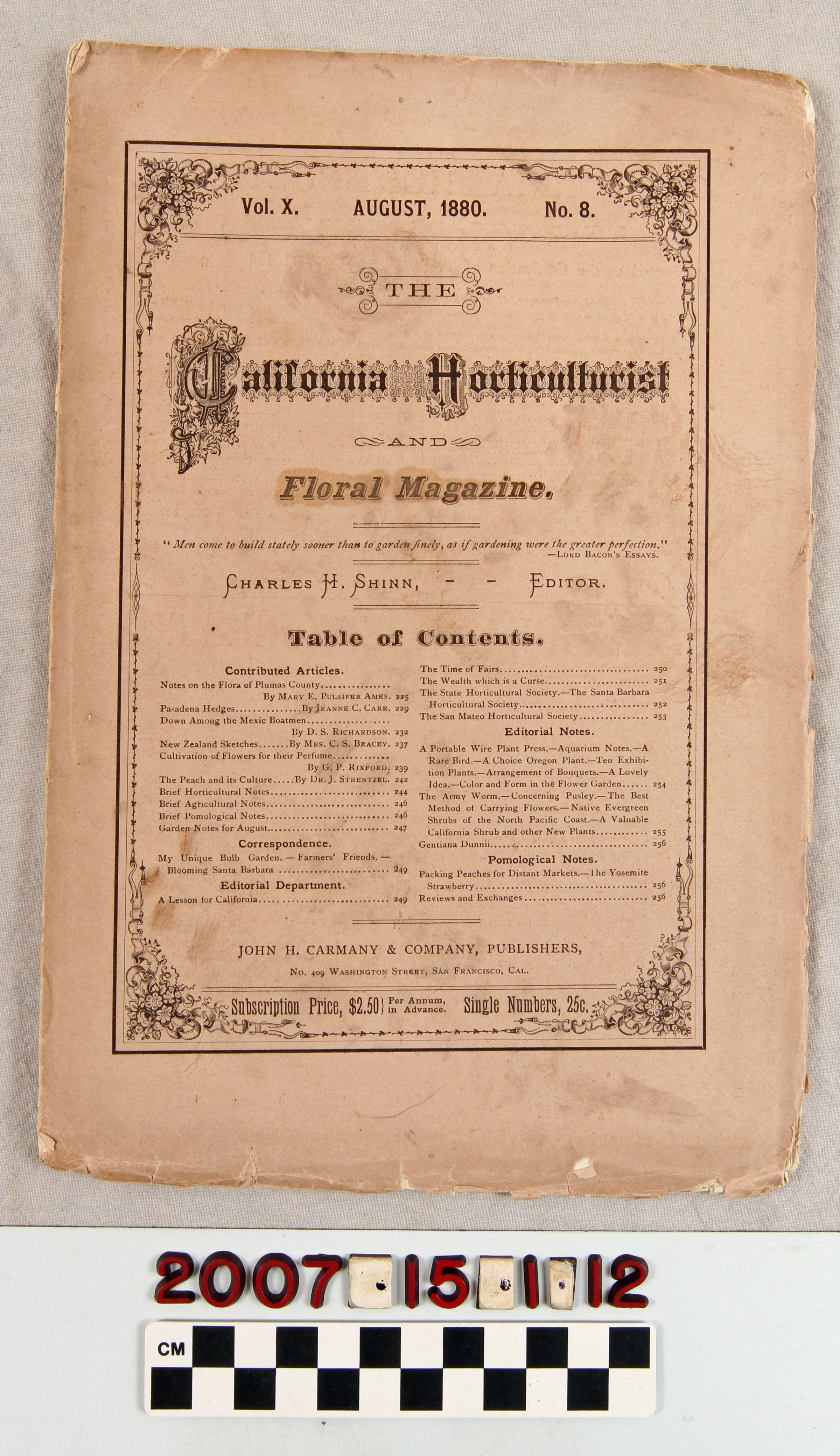 "California Horticulturist and Floral Magazine," Vol. X, No. 8 (August 1880), published by John H. Carmany & Co., San Francisco. The periodical is a general magazine for farming, landscape gardening, and related topics and has sections on "Contributed Articles"; "Correspondence"; "Editorial Department"; "Editorial Notes"; and "Pomological Notes". There is an article on the use of hedges in Pasadena. There are also advertisements. The wrappers have many tears, some missing portions, heavy creasing, soiling and staining, and other wear, while pages are dogeared and creased, so the condition is poor.