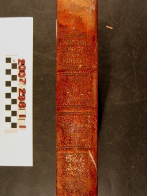 "California Mines and Minerals" (San Francisco: California Miners' Association,) 1899. The item, produced for the state meeting of the American Institute of Mining Engineers, contains articles by many contributors on the general mining industry; the mother lode area; electric power for mining; gold dredging; deep mining; petroleum mining; the fineness of gold; copper resources; reports by county and general regions of mining development; the miners' association; quicksilver mining; and more. There is also an advertisement section at the rear. With a weak binding, taped spine, much wear to the boards, but generally clean pages, the condition is poor.Lexicon