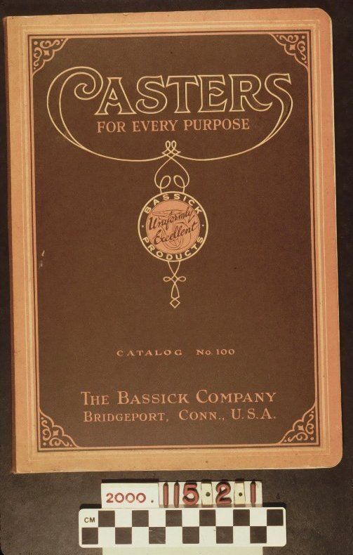 "Casters for Every Purpose," issued by the Bassik Company, 1922. The 80-page catalog has a brown paper cover with the title on the top and the name and address of the company on the bottom. At the center is a circle with a drawing of a caster in the middle and the words, "Uniformly Excellent." Below this is the catalog number. A border is around the printing on the front which is all in red and white ink. At the beginning are drawings of the company's three plants; a foreword; an alphabetical index; a numerical index; and a note regarding the catalog. There are many types of casters available for sale with such names as diamond velvet; Bassik; Harvard; universal; and gem. At the back is an advertisement for the company's line of automobile and cabinet hardware. Many black and white drawings are included. Three price lists, which are items .2-.4, were found within. With creases; abrasions; some foxing; surface soiling; stains, and a small tear on the back, the artifact is in fair condition.Lexicon