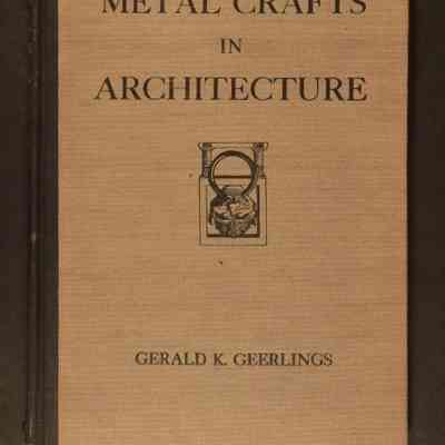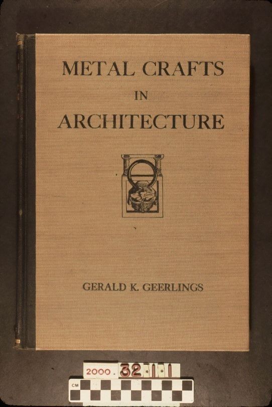 Color: Black; Green "Metal Crafts in Architecture," by Gerald K. Geerlings (New York: Charles Scribner's Sons, 1929,) 202 pp. A hardcover book without a dust-jacket and with a green cloth cover. On the front, at the top in large black letters, is the title, under which is an image of what appears to be a doorknocker, consisting of a round ring in the mouth of a monkey-like figure that is within a square. The author's name is toward the bottom. The spine is black and between two gold horizontal lines at the top and bottom is the title, author's last name, and, at the bottom, the publisher's name. Contents include chapters on bronze; brass; cast-iron; copper; lead; zinc; tin; lighting fixtures; and current developments in the 1920s on the uses of these materials and items. At the end of each chapter are sections of photograph illustrations, numbering from three to sixty-one in number. These illustrations show manufacturing processes, as well as finished products, which include architectural elements, such as doors, balconies, grilles, gates, furniture and furnishings, window frames and screens, and lighting fixtures as well as statuary. Specifications, a bibliography and an index of illustrations are at the end of the book, which also has a "raison d'etre," explaining why the book was written and an acknowledgements section. There is fading and dented corners on the cover and abrasions on the edges of the spine, but the book is overall in good condition.